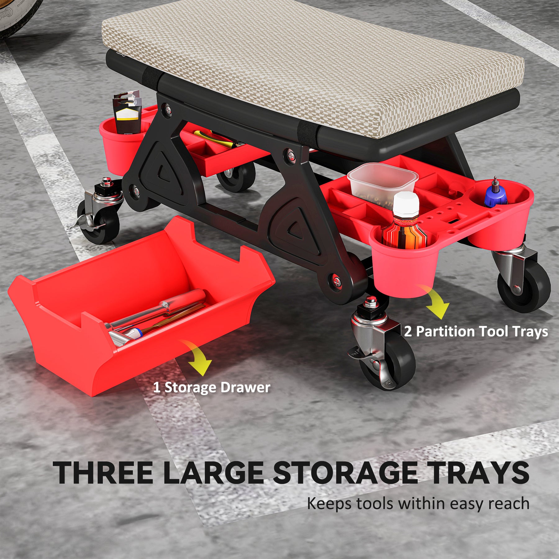 Transform how you tinker with the HOMCOM Mechanic Roller Seat! Its robust build comfortably supports up to 300 lbs (135 kg), ensuring no wobble as you glide on its smooth 360° casters. The ergonomically designed concave seat keeps you comfy as you work. Plus, keep tools handy with two storage trays, a large drawer and two cup holders. Roll smoothly and work efficiently!