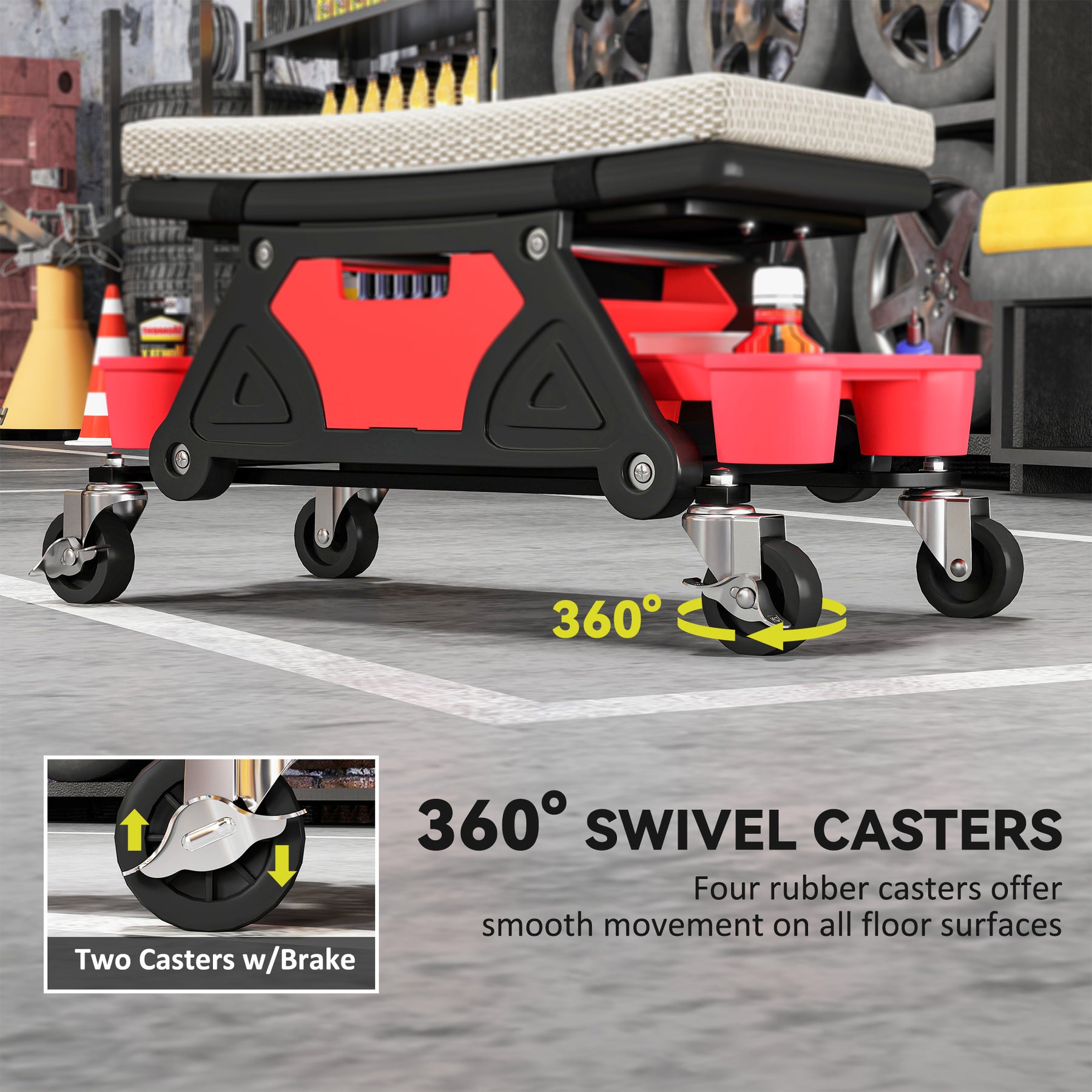 - • Braking casters secure seat in place on any surface