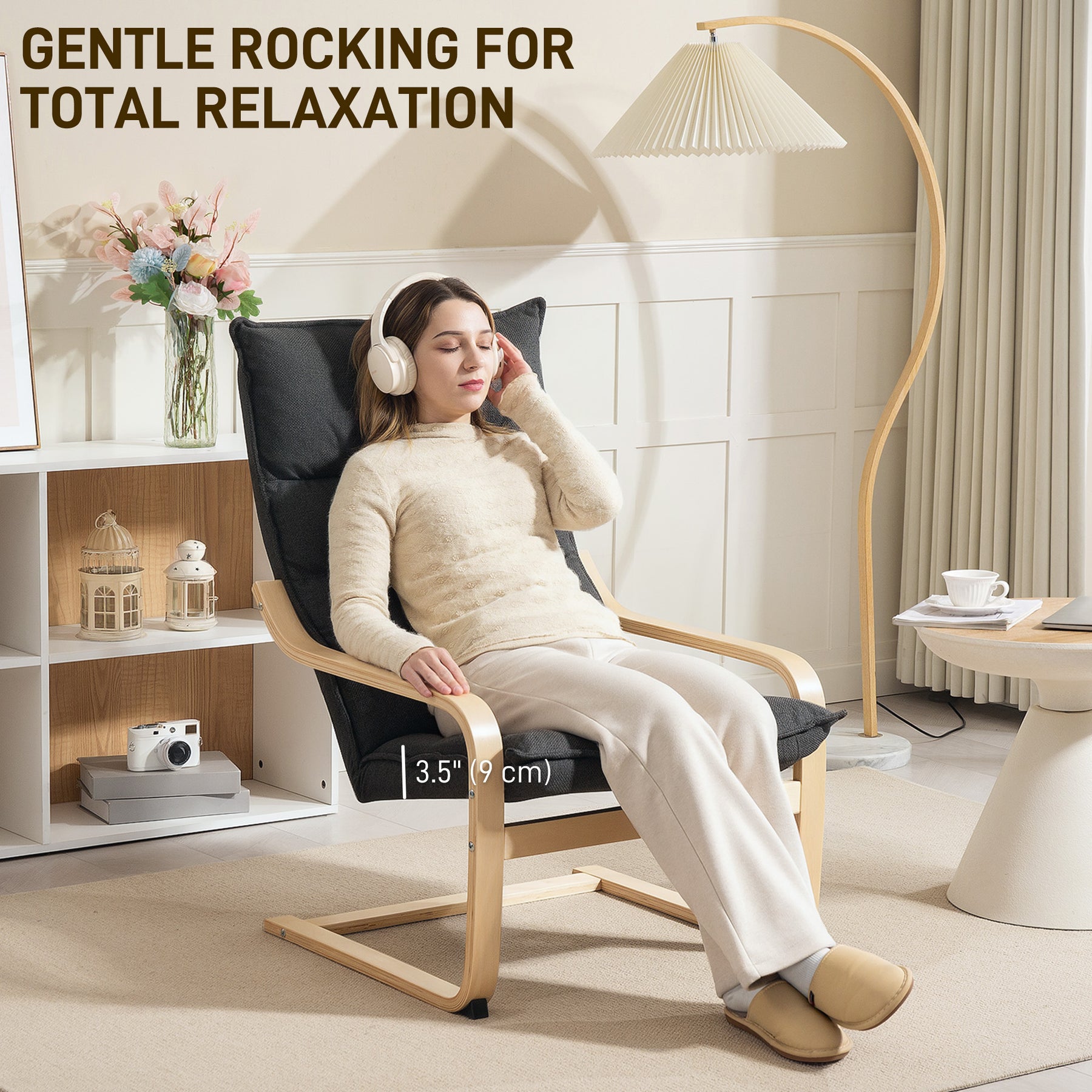 Discover the HOMCOM accent chair, a great blend of modern design and natural charm. Featuring robust solid wood armrests and a soft, breathable linen-feel fabric, this chair for bedroom promises both style and comfort. The high backrest offers excellent support, while the gentle rocking motion adds a soothing touch. Whether as a cozy reading chair or a statement piece, it creates a relaxing spot to unwind and enjoy your favorite book or simply relax in comfort.