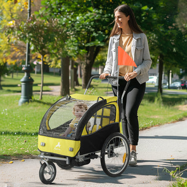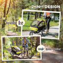 Aosom 2-in-1 Bike Trailer for Kids, Foldable 2-Seat Baby Stroller with 5-Point Harness, Rubber Wheels, Storage Bag, Yellow