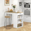 Transform your space with the HOMCOM multi-functional piece that effortlessly blends as a chic bar table, a cozy pub table, or a stylish kitchen bistro table. Its modern wood effect top not only serves as a charming hallway console or a practical kitchen buffet but also offers a drawer and 3 open shelves to neatly store your essentials, all while providing ample tabletop space for two.