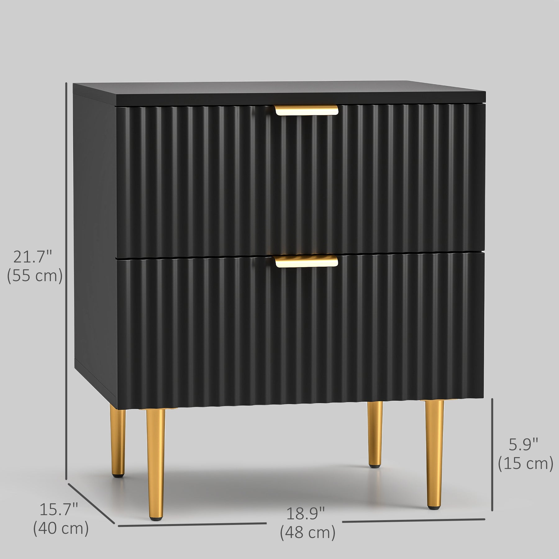 Add a splash of modern elegance to your space with the HOMCOM Nightstand. This chic black bedside table features sleek gold finger pulls and fluted drawer panels for a sophisticated look. With two spacious drawers, it keeps your essentials organized and your area clutter-free, whether used as an end table or a night table. Elevate your decor and functionality effortlessly!