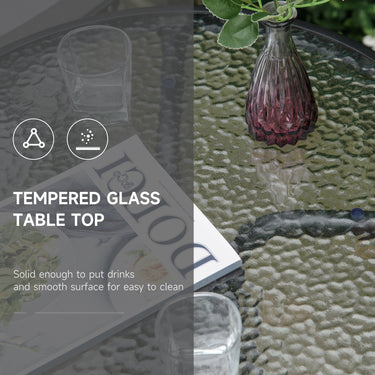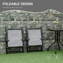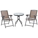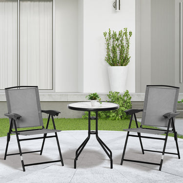 The Outsunny 3pcs patio furniture set consists of a tempered glass-top bistro table for 2 and 2 folding chairs. The folding patio chairs feature an adjustable backrest, which allows you to find the perfect position to relax. You'll sit comfortably on the chair with its smooth seat and curved arms, enjoying drinks and meals with family or friends in your leisure time. The outdoor bistro set is the perfect way to enjoy a cafe-style experience right outside your very own door with Outsunny!