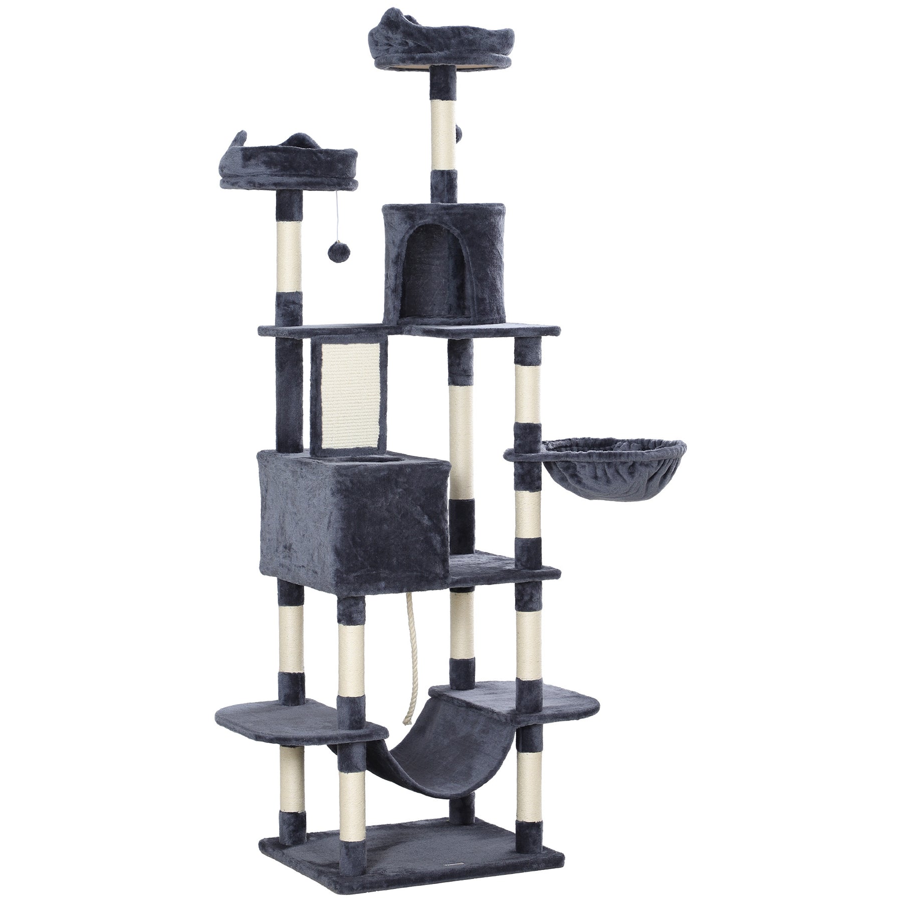 Transform your home into a feline paradise with the PawHut large cat tree! This tall cat tree features cozy cat beds, spacious condos, and two hammocks for lounging, ensuring your furry friends stay entertained with a cat scratching post and toy balls. Its stable base and sisal surfaces encourage natural scratching behavior, blending seamlessly with your decor. Suitable for 1-3 cats.