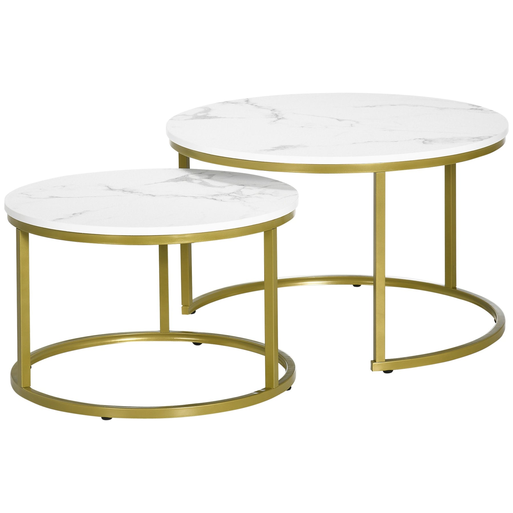 Whether you pull them apart or push them together, these HOMCOM coffee and end table set will make a great first impression in your home. The nesting tables for living room comprise a larger and a smaller table that perfectly overlaps each other, making it ideal for compact storage if necessary. To ensure a sturdy structure, each table base is made of steel. The tops of nesting coffee tables are covered in a beautiful marble effect that will retain its style and beauty for many years.
