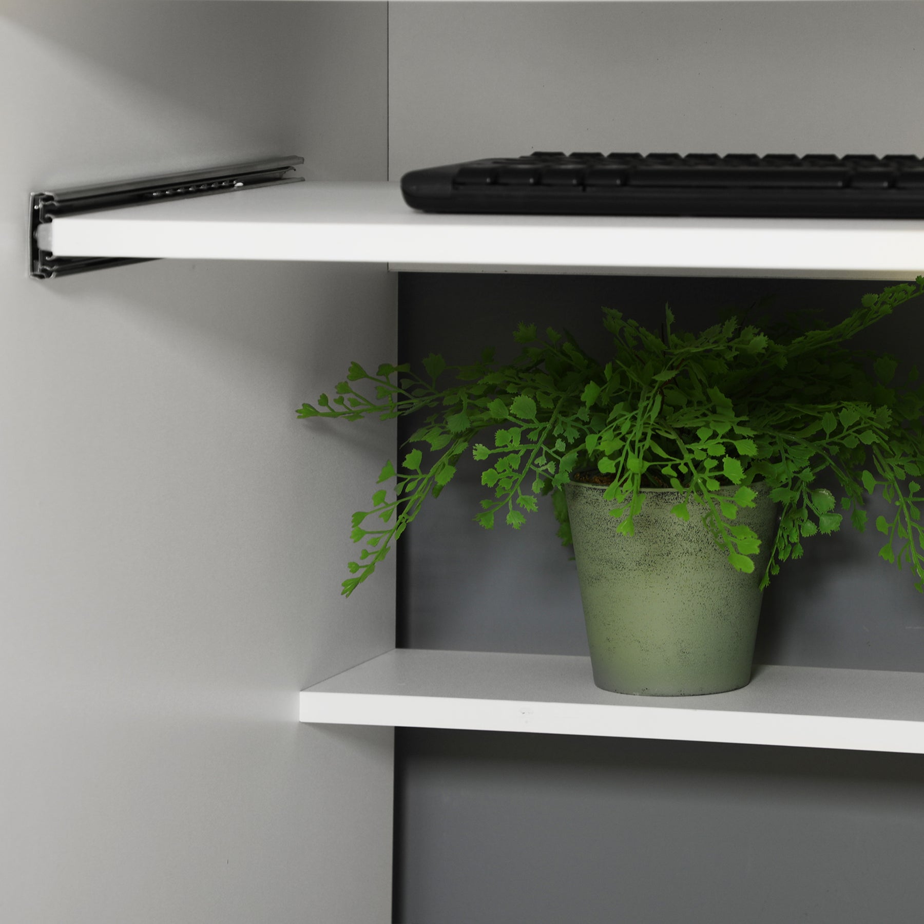 - • Ample Storage Space: 1 keyboard tray, 1 cabinet, 3 drawers, 2 open shelves