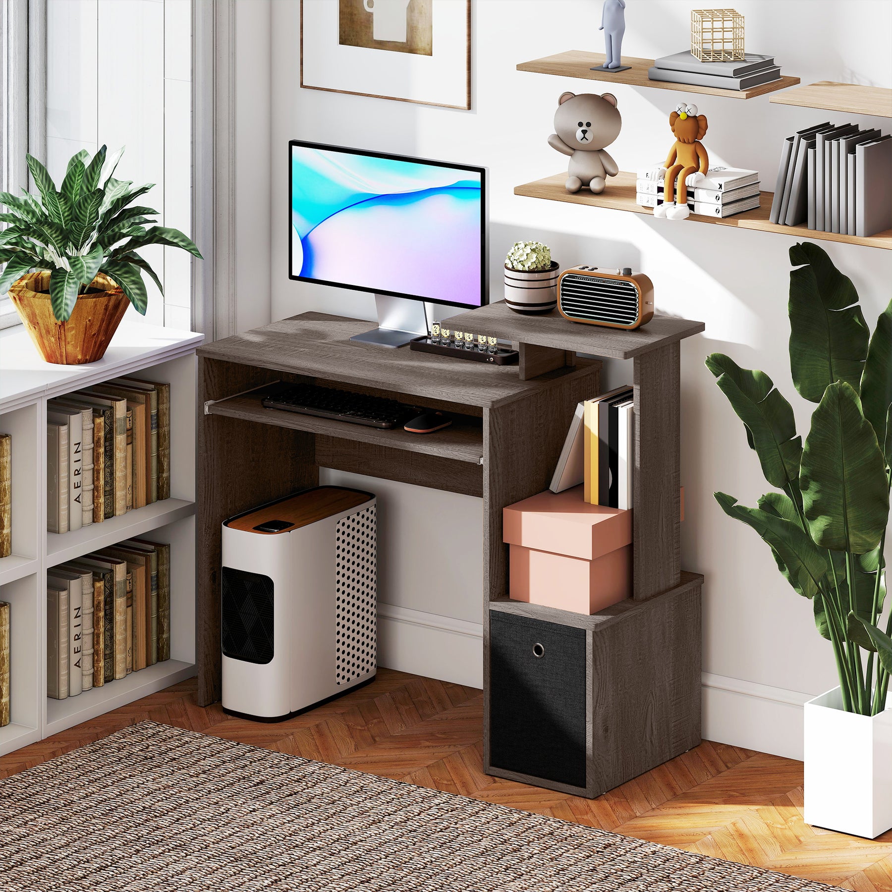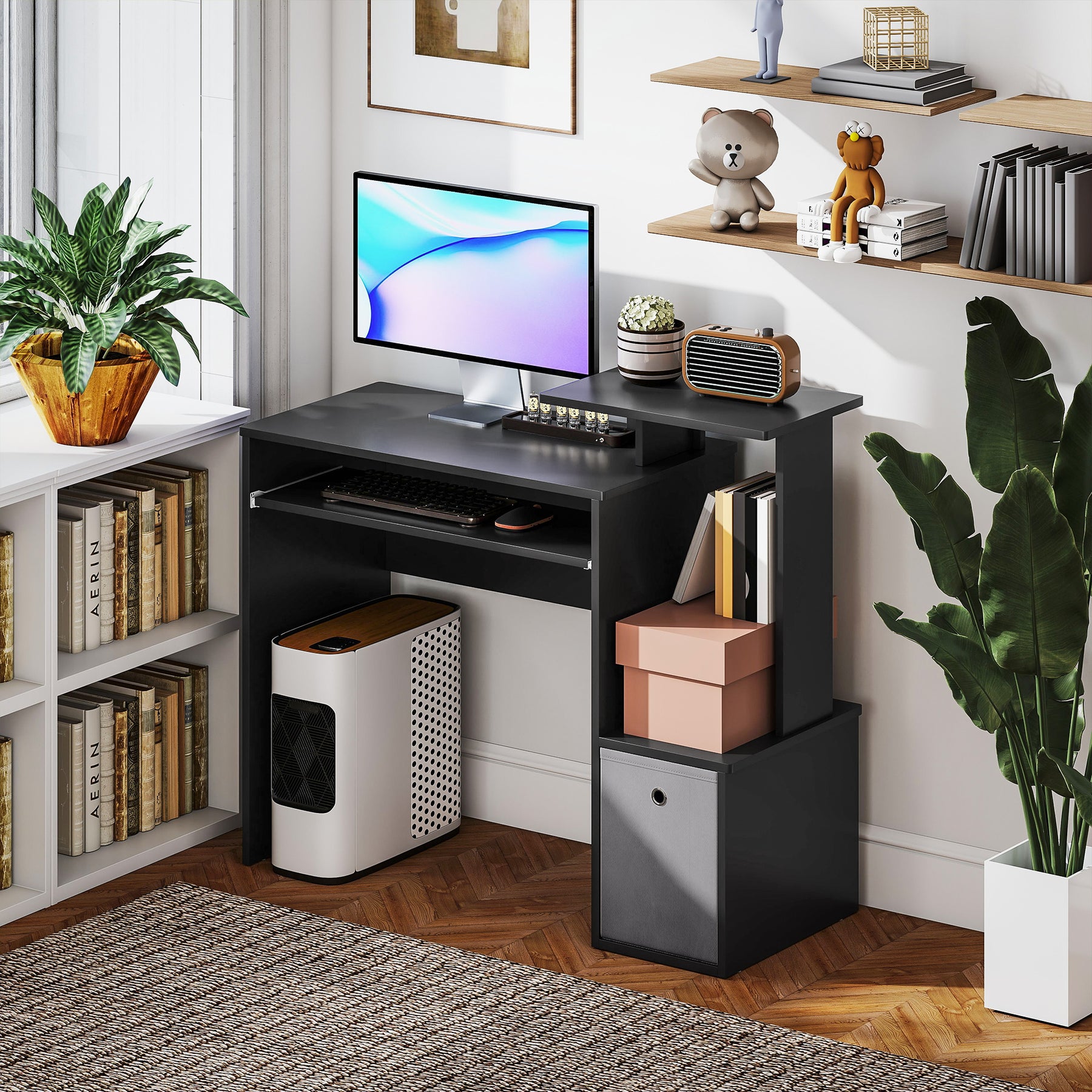 This HOMCOM computer desk with keyboard tray boasts a unique design you'll instantly fall for. Its obscure shape is formed of a moderately-sized tabletop, a keyboard tray, an open side shelf and a bottom drawer - giving you plenty of room to work and keep your papers etc. Made from particle board, the study desk's structure is robust, with a smooth melamine coating to protect against light marks from daily use. It's finished with a soft fabric drawer for discreet storage.
