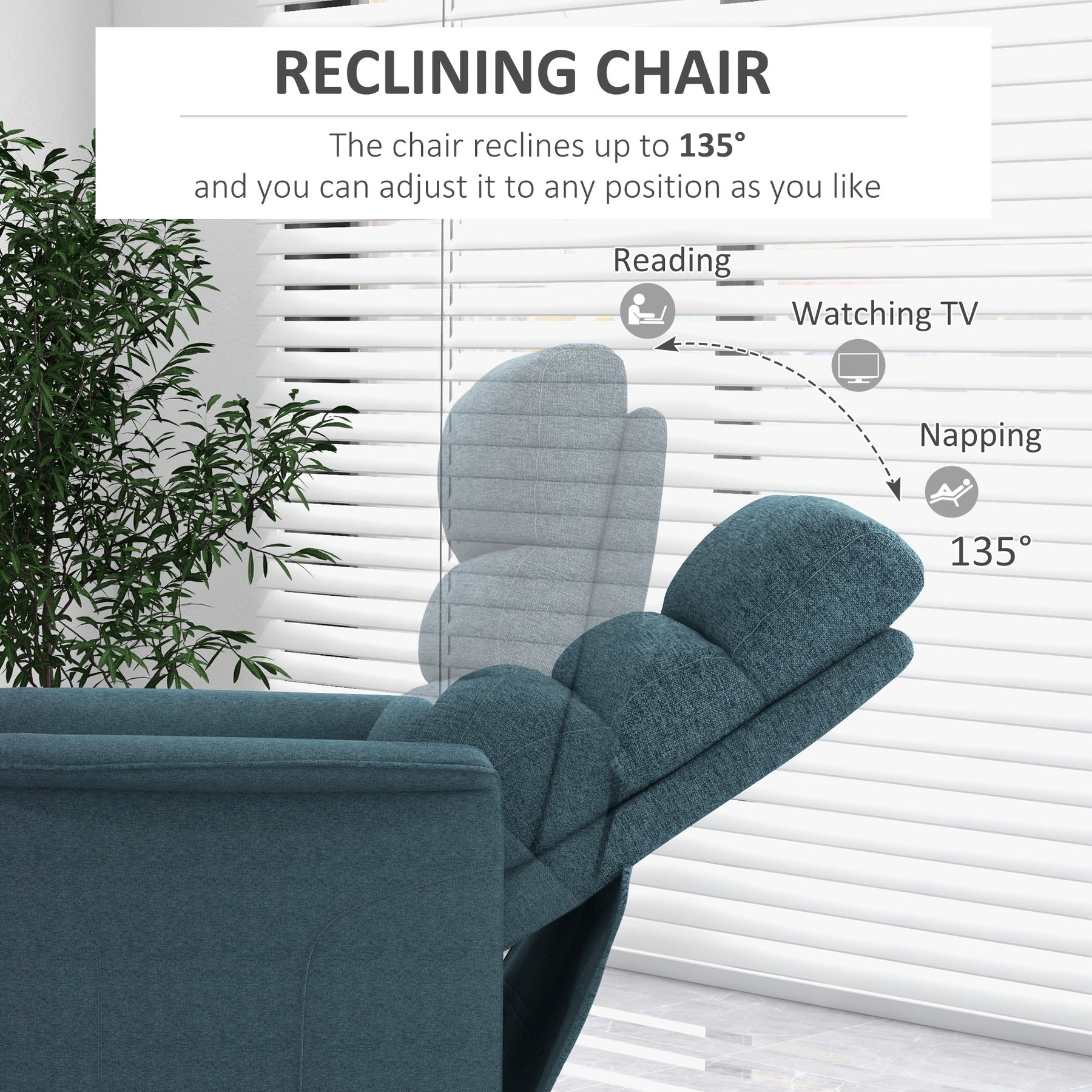 - • Backrest can recline up to 135° along with the footrest for comfort