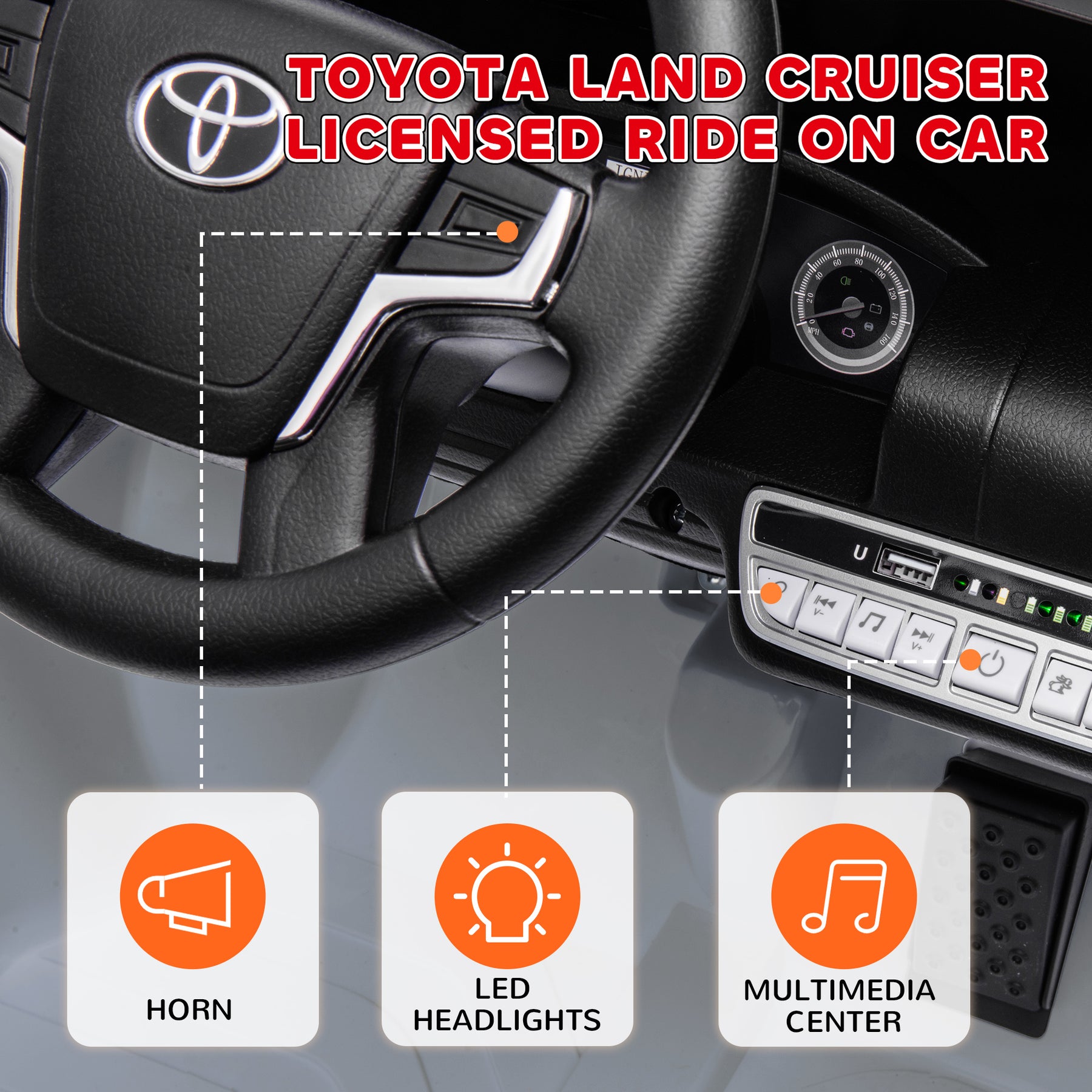 Embark on a thrilling adventure with the Qaba Kids Electric Car, a Toyota LAND CRUISER licensed ride on car! Featuring built-in songs, USB port, and FM radio for endless entertainment, plus a horn and two headlights for realistic play. Parents can control the speed and direction with a remote, ensuring safety while offering kids the joy of independence. Suitable for 37-72 month-old explorers!