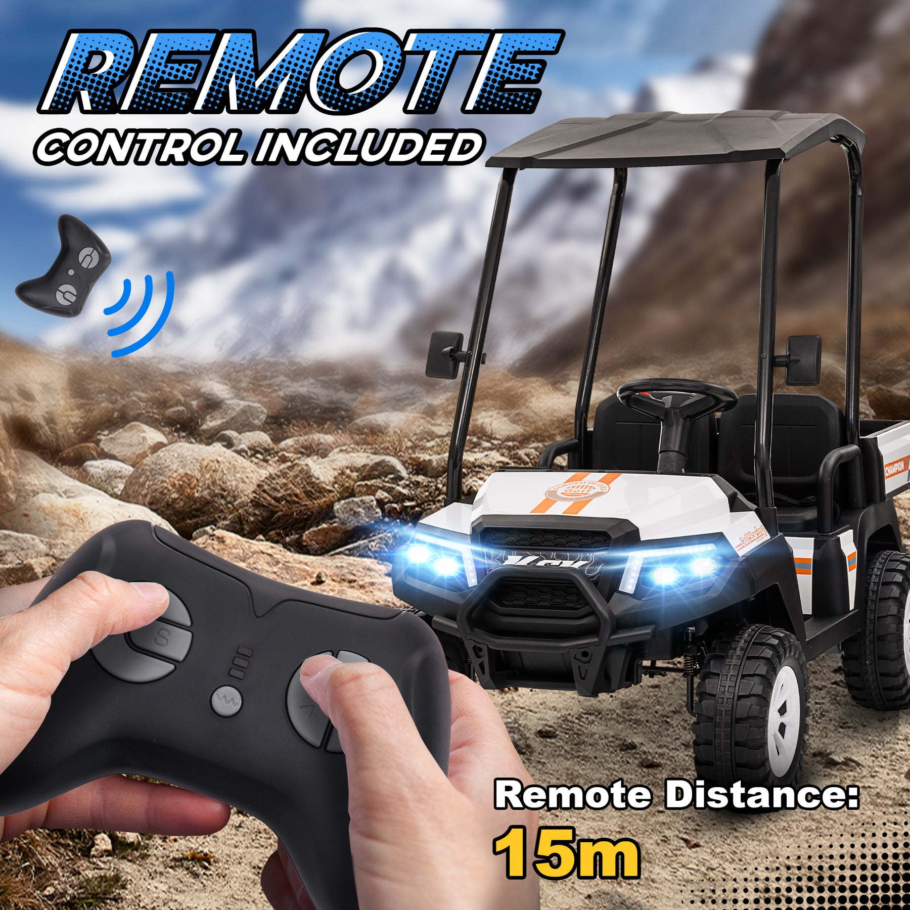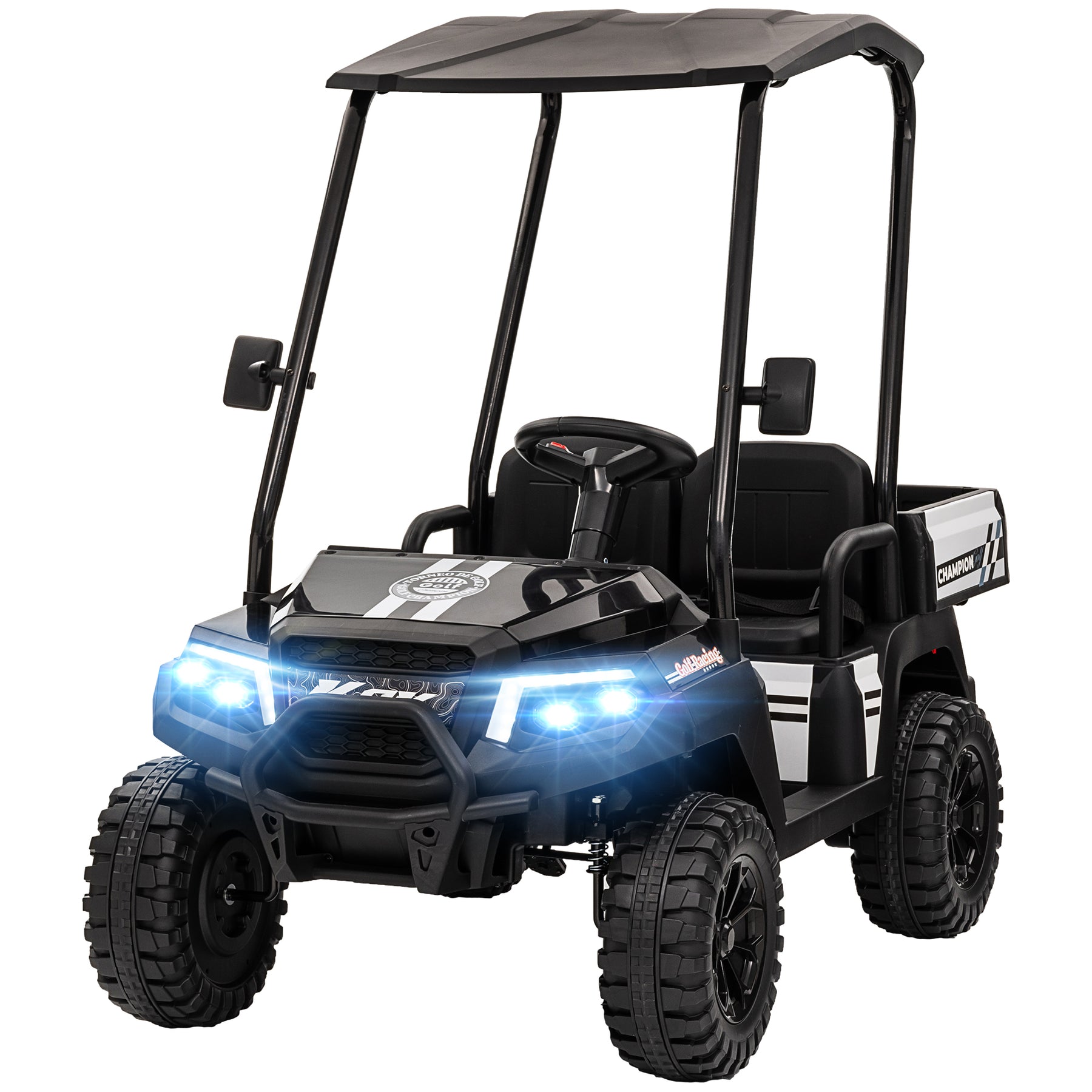 Explore the great outdoors with your little child in the Qaba two-seater electric car for kids! Featuring a sun shade for sunny days and a rear storage for hauling toys, this kids ride on car adds adventure to playtime. Enjoy melodies and a honk-worthy horn while cruising at a safe 1.9-3.7 mph (3-6 km/h). Suitable for kids aged 3-8 to take the wheel or be guided by parent remote control.