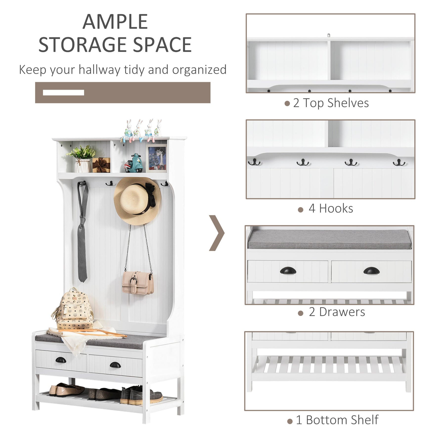 Keep your coats, bags, shoes and small items well organized with our modern hall tree with bench and shoe storage from HOMCOM. This hall tree with 4 hooks for hanging your coat, 3 shelves total for placing shoes, plant and bag 2 drawers for personal item such as keys and socks. Anti-tilt device on the back ensure it keeps securely in place. Finished in a modern style, it will work perfectly with many style decors, and you'll love having it as part of the furniture.