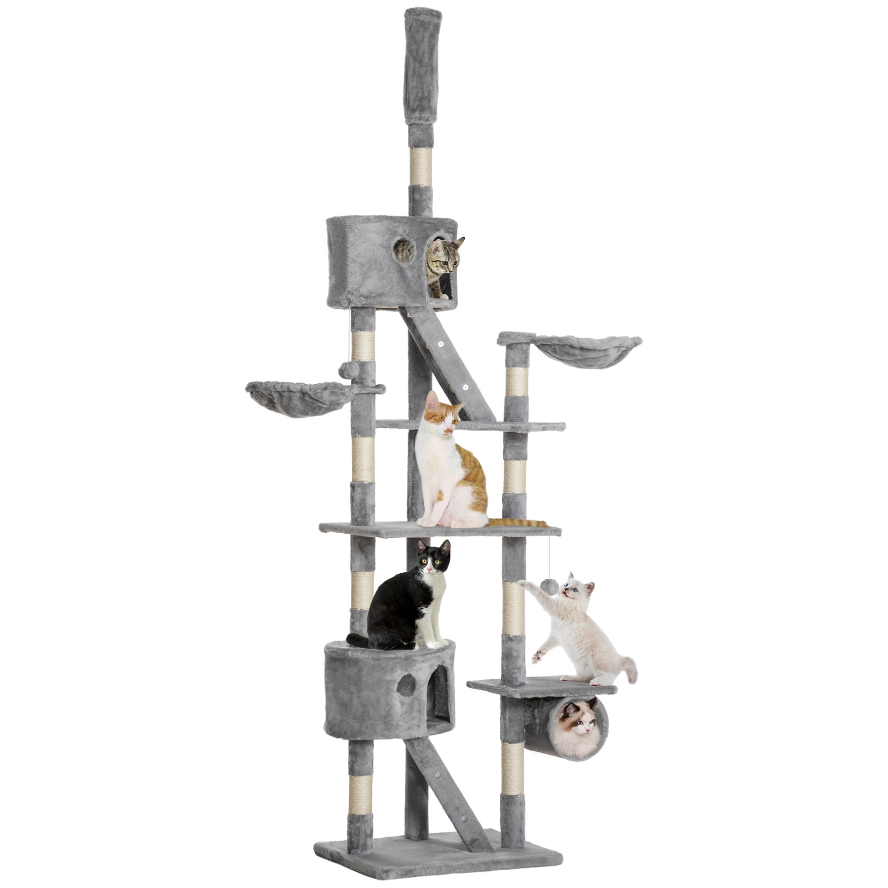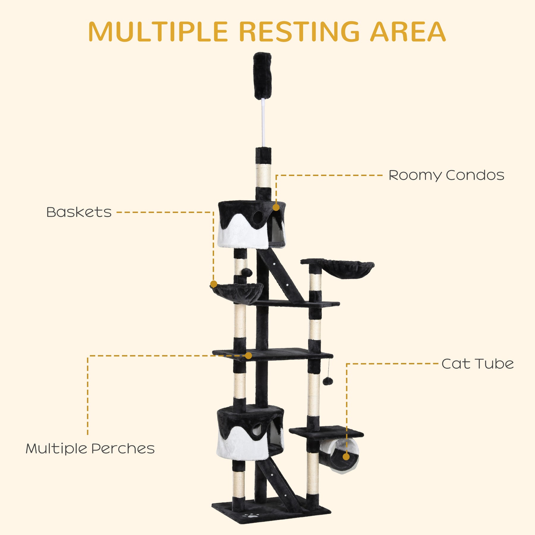 Give your furry friends a place with this tall cat tower. With multiple platforms to lounge and bask on, this multi-tiered cat tree is a great solution for homes with more than a frisky feline! The posts feature scratching areas, offer them plenty of places to stretch and exercise their claws. With multiple platforms to choose from, your cats are bound to have an absolute blast with this large cat tower!