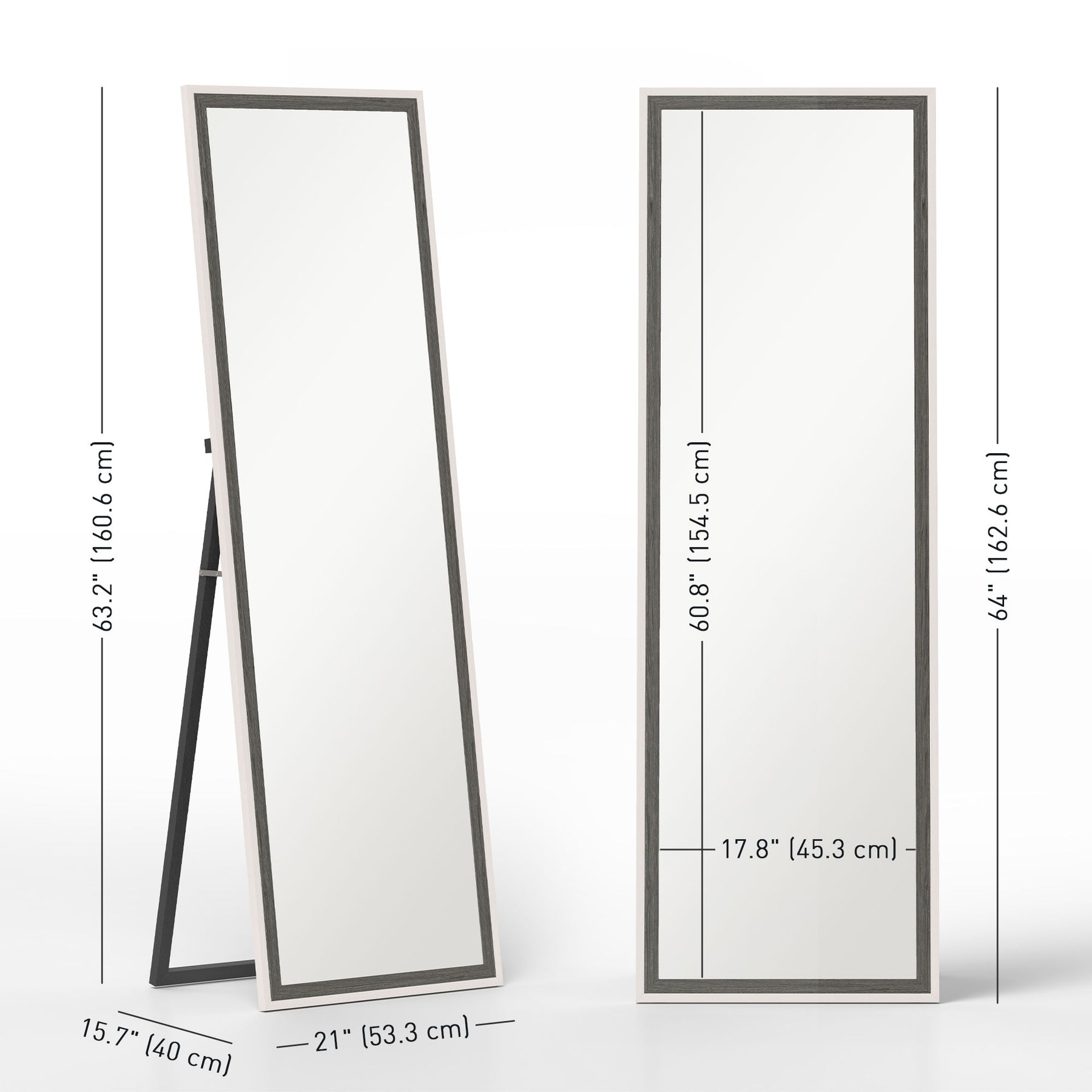 Step into style with the floor mirror from HOMCOM, featuring a chic two-tone MDF frame in sleek white and dark wood grains. Measuring 64" x 21" (162.6 x 53.3 cm), this large mirror offers a flawless full-body reflection with high-definition glass, complete with a shatter-proof film for peace of mind. Choose to stand it up, lean, or wall mount it for a versatile reflection in any room.