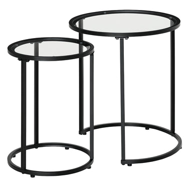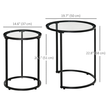 Enjoy this lovely set of two HOMCOM coffee tables at your next chat party or afternoon tea! The simple and fashionable design with a metal base and tempered glass tabletop provide you with an unforgettable visual experience. This set can be used in the living room, bedroom, dorm, and other areas. The round end table set can be divided into two pieces and used separately. It can be nested when not in use to save space. A functional and stylish table set adds a touch of simple joy to your home!