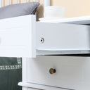 - • Two drawers with handle, top and bottom opening shelf provide ample storage space