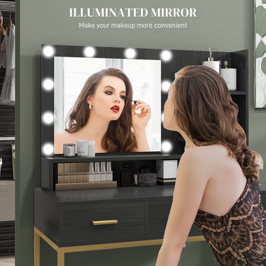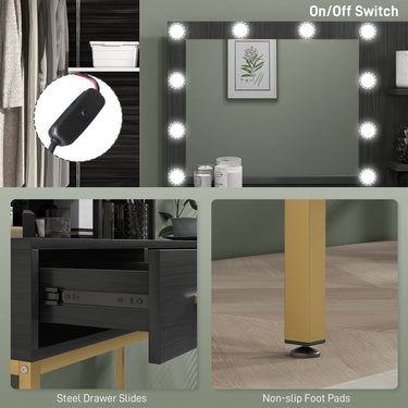 Transform your beauty routine into an enchanting experience with the HOMCOM make up table! Revel in the ample storage of three large drawers, complemented by three open shelves to showcase your perfumes and cosmetics. Add a touch of Hollywood glamour with a big, illuminated mirror, featuring 10 dazzling LED bulbs. Designed to bring elegance and ease to your bedroom or dressing space!