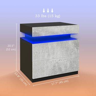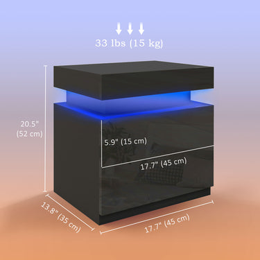 Update your bedroom into a modern, stylish space with our nightstand. Our HOMCOM night stand is an addition to any bedroom decor with a sleek and contemporary design. The built-in LED light strip with 16 colours and four changing modes(flash, strobe, fade, smooth) allows you to create the great ambience for any mood. And with the included remote control, you can easily adjust the light settings without getting out of bed. Transform your bedroom into a sleek and modern oasis today!