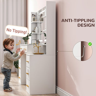 - • Spacious tabletop with seven drawers and eight open shelves organizes cosmetics efficiently