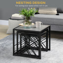 Enjoy sleek and minimal styling at its best with these nesting coffee tables from HOMCOM. Consisting of a large, a medium and a smaller sized table, each table is made using a black metal frame for a stable and durable core, with the simple colour particle board tabletops for a unique look. The stackable design helping to free up space when not in use. A functional and stylish small coffee table set adds simple happiness to your home!