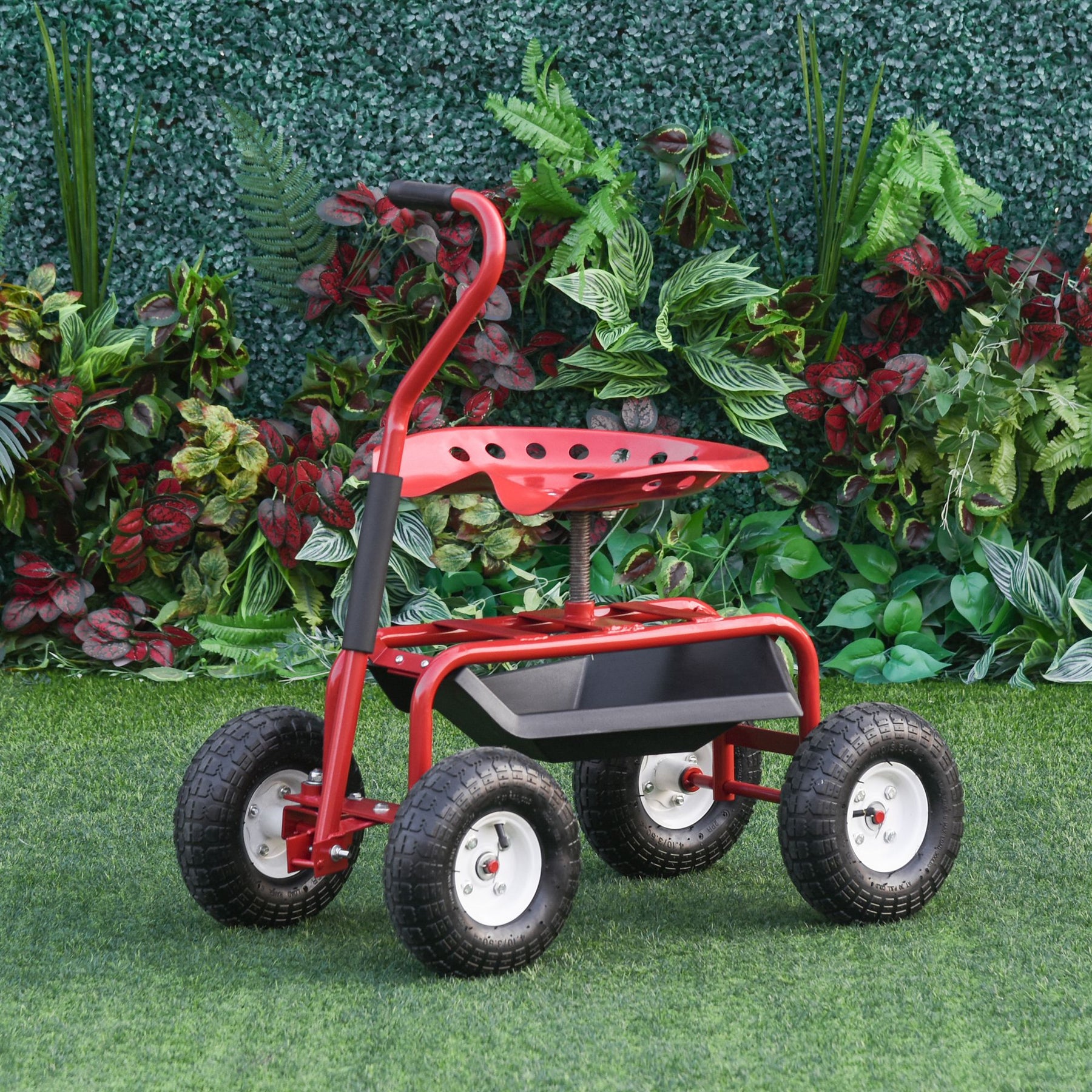 This Outsunny garden scooter with seat and wheels is a necessity for any gardener. Made of metal frme for enough stable, and the garden car can be easily moved around with 4 wheels, the front wheels can steer using the pull handle. Including a swivel and height adjustable seat for you to tend your plants and landscape with comfort. There is a utility basket at the rear and also a tray under the seat for tools.