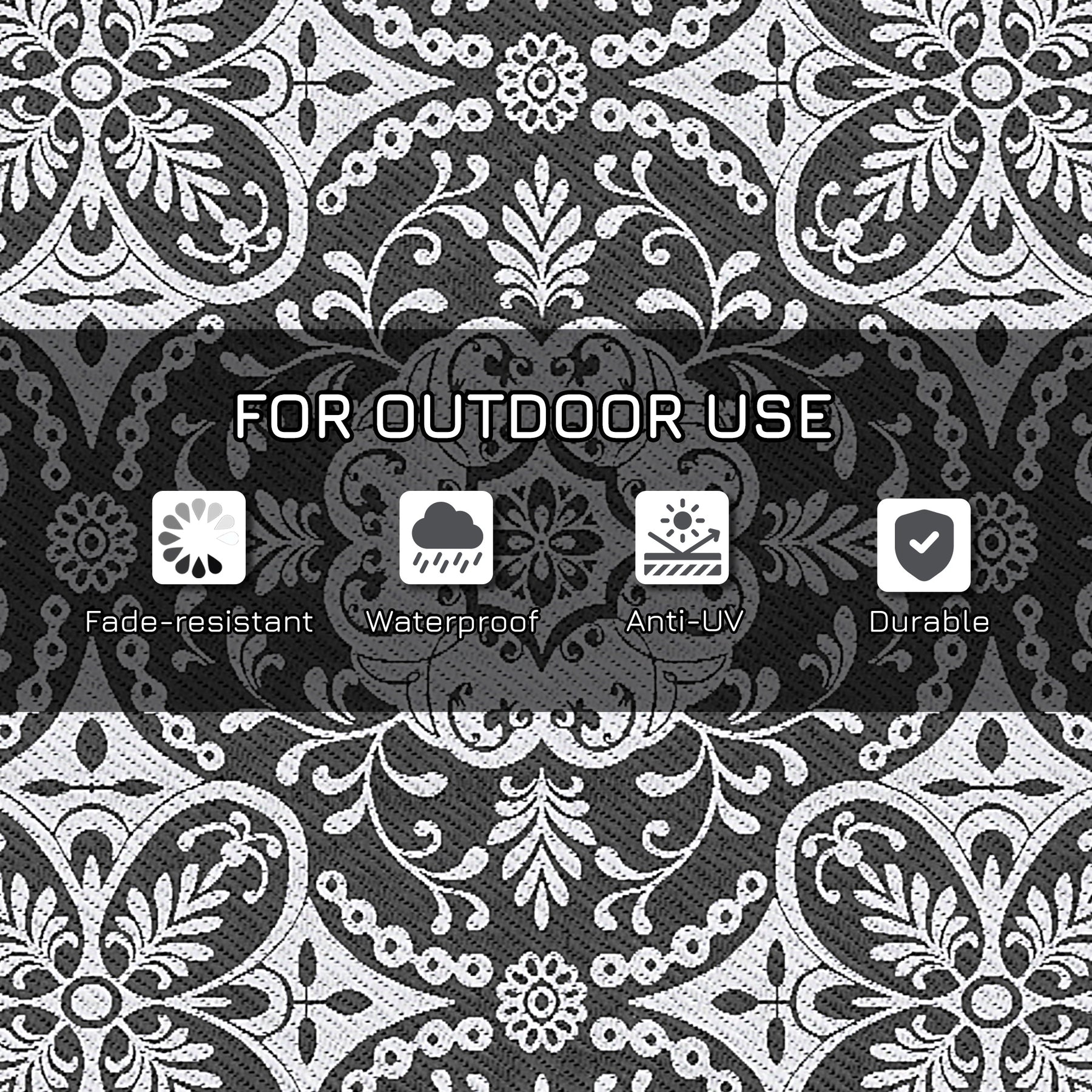 Set up your activity base for camping or other outdoor activities. The waterproof outdoor rug with a carrying bag is specially designed for outdoor use like camping, picnic, road tour, etc. It's widely suitable for camper vans, RVs, the beach, gazebos, patios, playrooms, and anywhere you need it. The durable material resists water and UV, which is anti-fading and protects from ground moisture. Furthermore, flip it over to update the look and style! Be the envy of your friends.