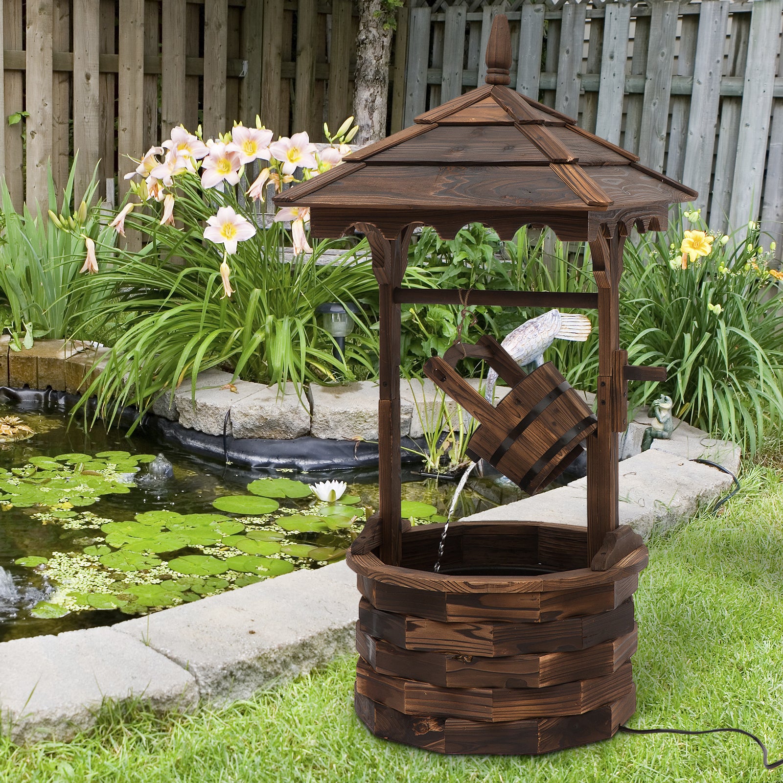 This Outsunny wishing well water pump fountain is an ideal addition to your backyard, patio or garden. It has been given a carbonized treatment to give it a weathered look, but it will last for years! Its round wishing well bucket with plastic liner acts as the outlet for pumped water to be released in fountain style. It needs to work with an electric water fountain pump (included), which brings water back up from the wishing well tank to keep water flowing. Simply plug it in and fill with water, it will work as you desired. Get your wish for an attractive, low-maintenance fountain.