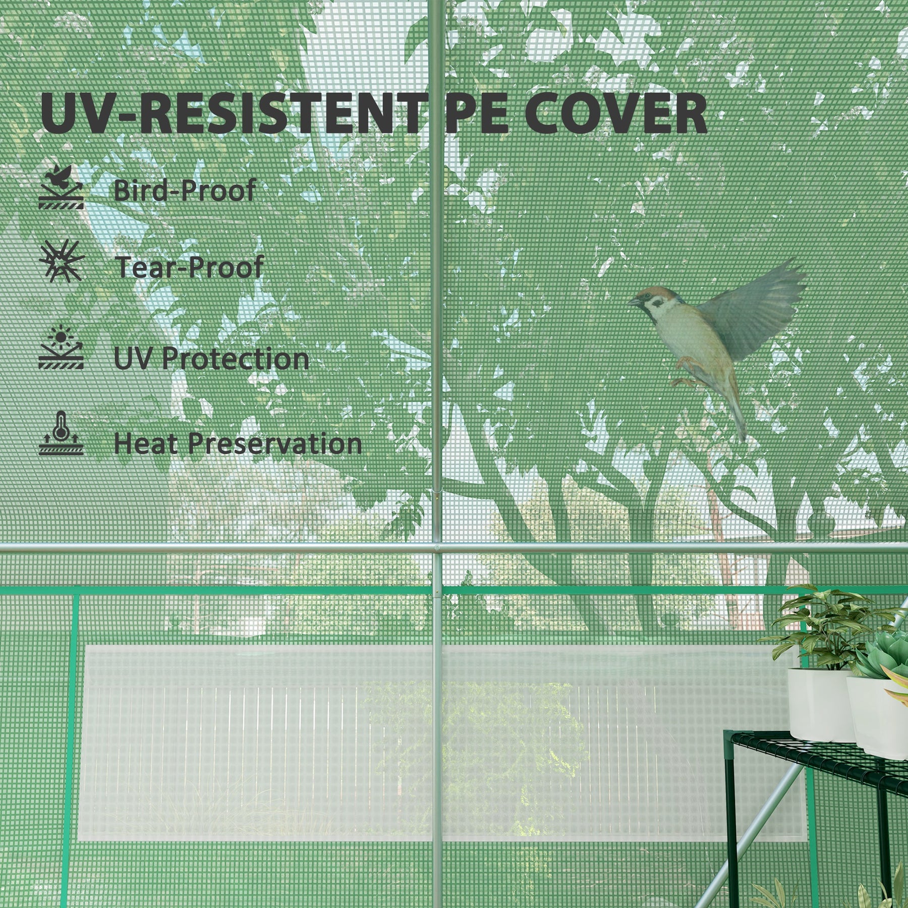 - • 140 gsm PE cover allows 85% sunlight penetration, resists UV