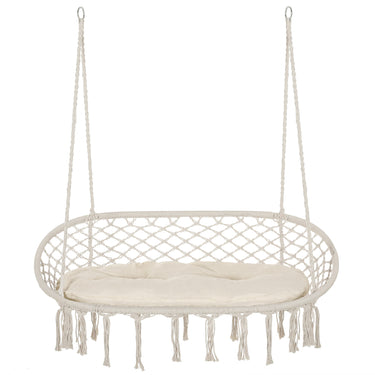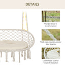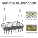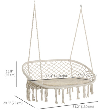 Infuse elegance into your indoor and outdoor spaces effortlessly with this double seat hanging rope hammock chair from Outsunny. Boho style chair is crafted into a spacious two-seater design, where netting cotton rope forms the seat and back, and with fringe tassels for an attractive and unique looking. Made from metal for strength and reliability, the front seat is slightly curved for comfortable sit, and with armrest offering support when needed.