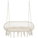 - • Hanging hammock chair features macrame net pattern with fringe tassels