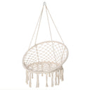 The bohemia-inspired design hanging chair with fringes is a delight on a lazy afternoon.This versatile hanging chair is suitable for lounging in the house, napping on the patio, or hanging out on camping trips. Woven polyester-cotton blend fiber offers a breathable, comfortable experience, while steel frame adds to its stability and durability.