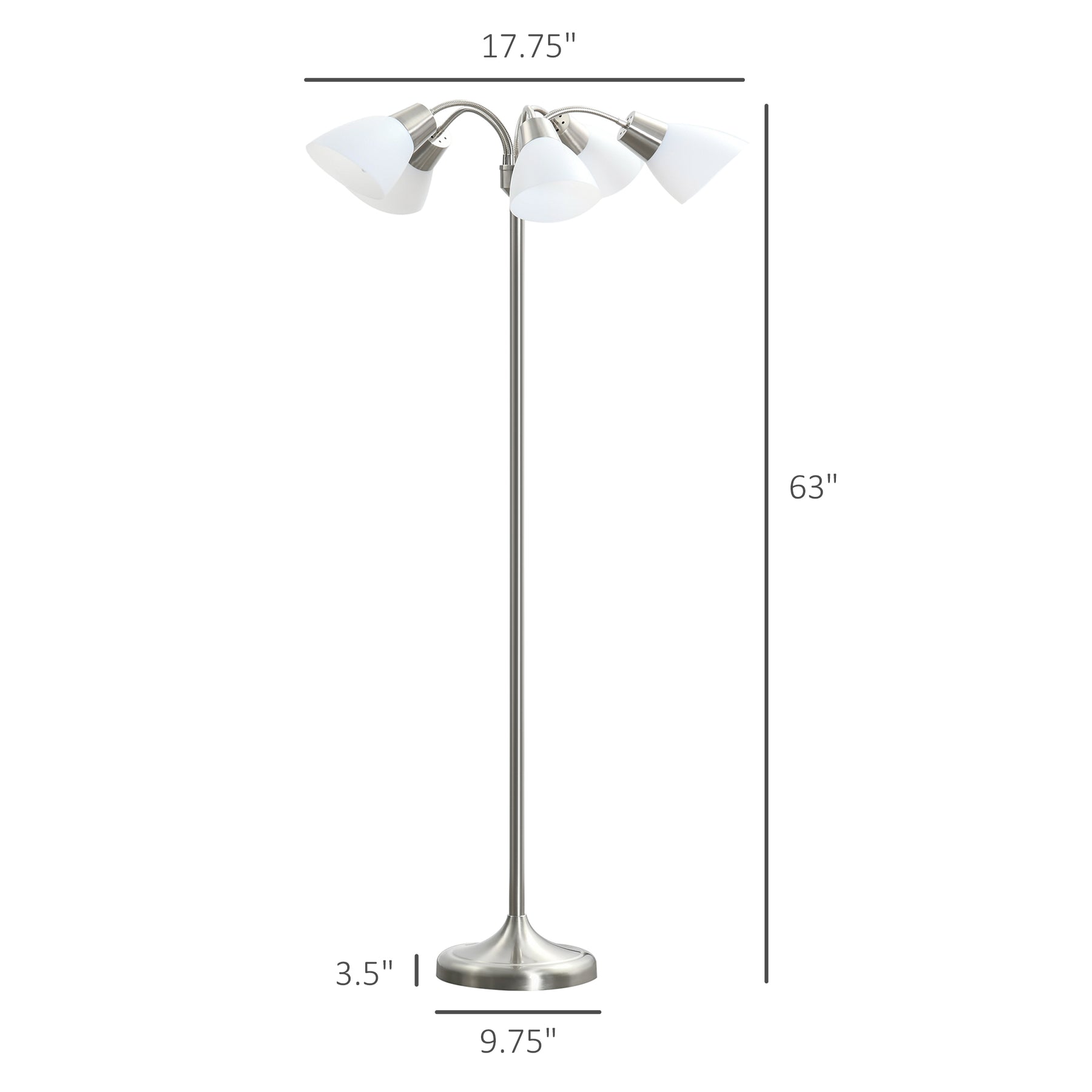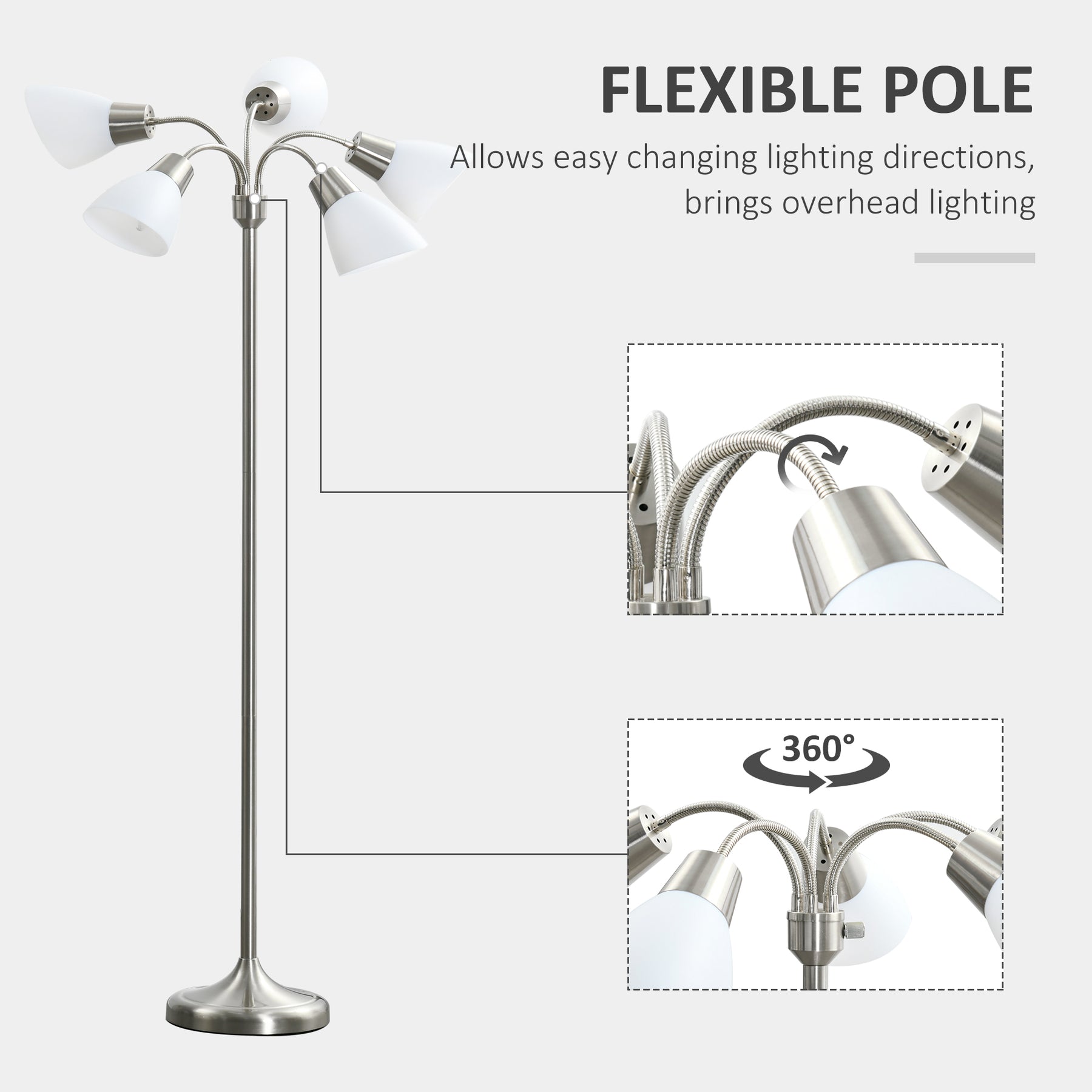 Say no to the normal and let this sophisticated, contemporary lamp to match your style. HOMCOM 5 light floor lamp brings an enjoyable overhead light for reading, working, and other hobbies, helping you set the mood in your home while making the light soft and welcoming. Reinforced tripod base for high stability and great balance. This uplighter floor lamp has a modern, chic style that will make your home unique and warm.