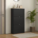 - • Three flip drawers store up to 18 pairs of shoes with max size CA 10