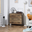 Are you looking for storage solutions and a decorative update for your bedroom? A new dresser always adds style and organization. This cabinet has four storage drawers to keep your things in order. All of them have black handles to open and close quickly. This sturdy chest of drawers is made of engineered wood with metal legs. Take a look at our cabinet with drawers and put everything in order.