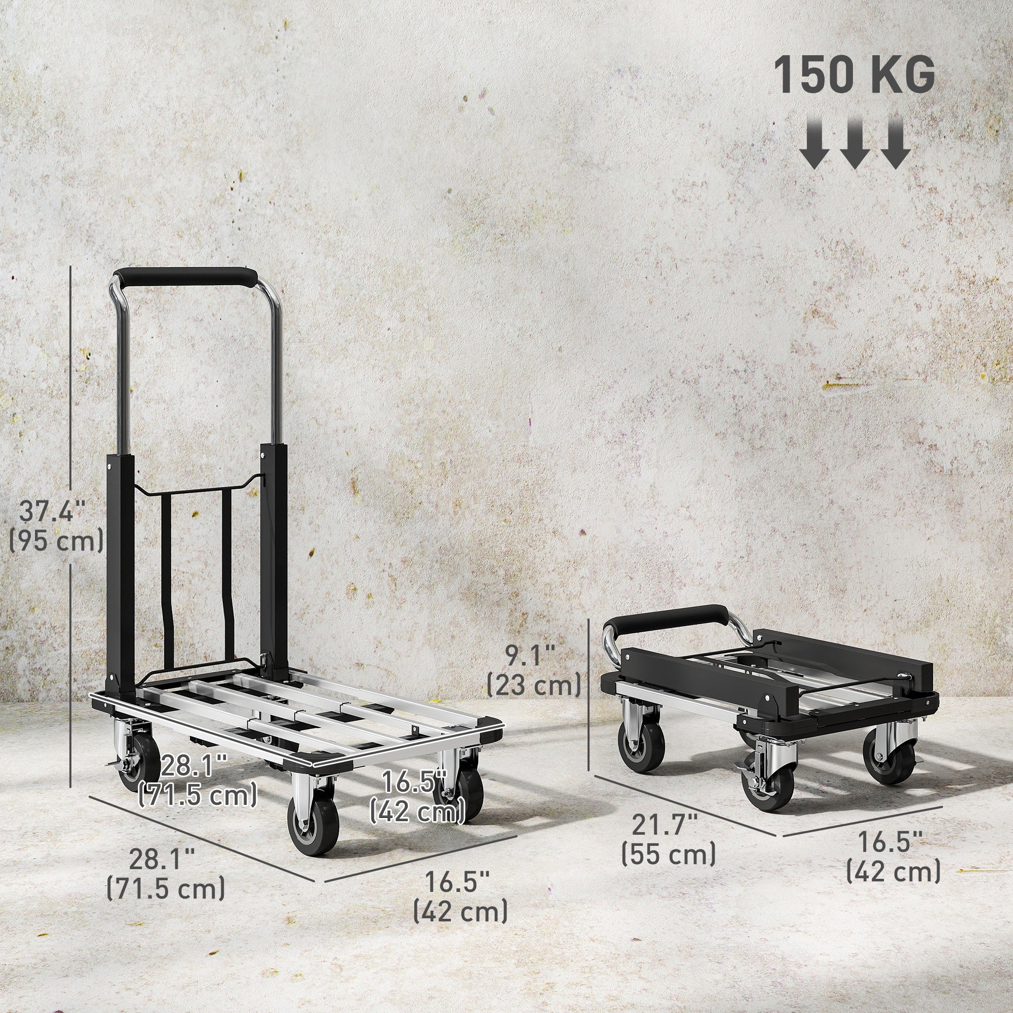 Struggling with bulky boxes and endless trips? The strain of moving heavy supplies or oversized packages can turn a simple task into a day-long chore. The HOMCOM folding hand truck transforms your experience, featuring an extendable platform for large loads and a 330 lbs.(150 kg) capacity. This hand truck trolley handles it all in one go, then folds away for easy storage, bringing effortless convenience back into your busy life.