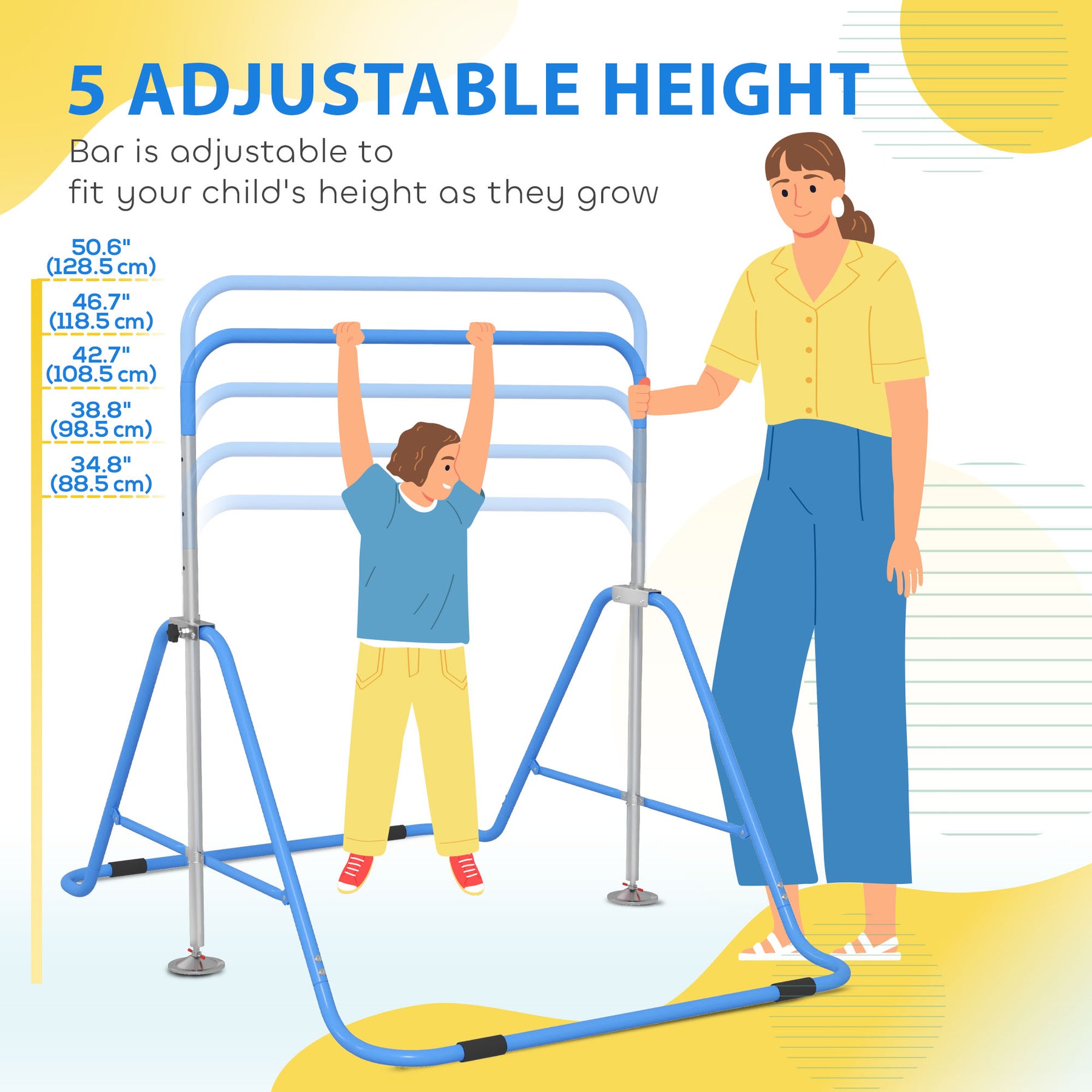 When you provide your child an outlet to burn energy, you need a design stays still and sure-footed for safety. This kids gymnastics bar from Qaba has the sound and secure, firmly grounded base you need, featuring shock absorption to reduce vibrations, non-slip feet, and structural integrity. Fold the stand up to keep it out of the way when not in use. This highly adjustable design is built to let your kids work out at home.