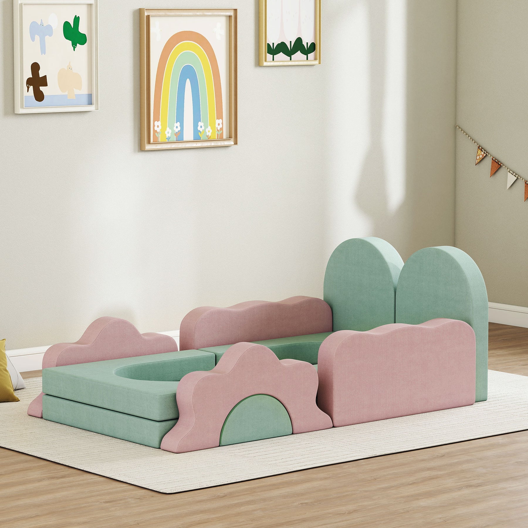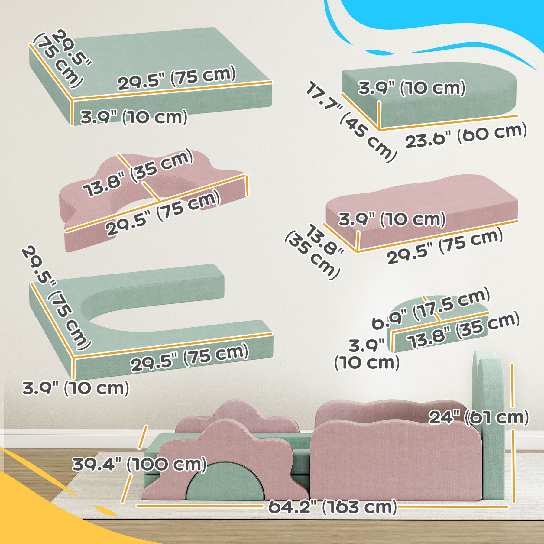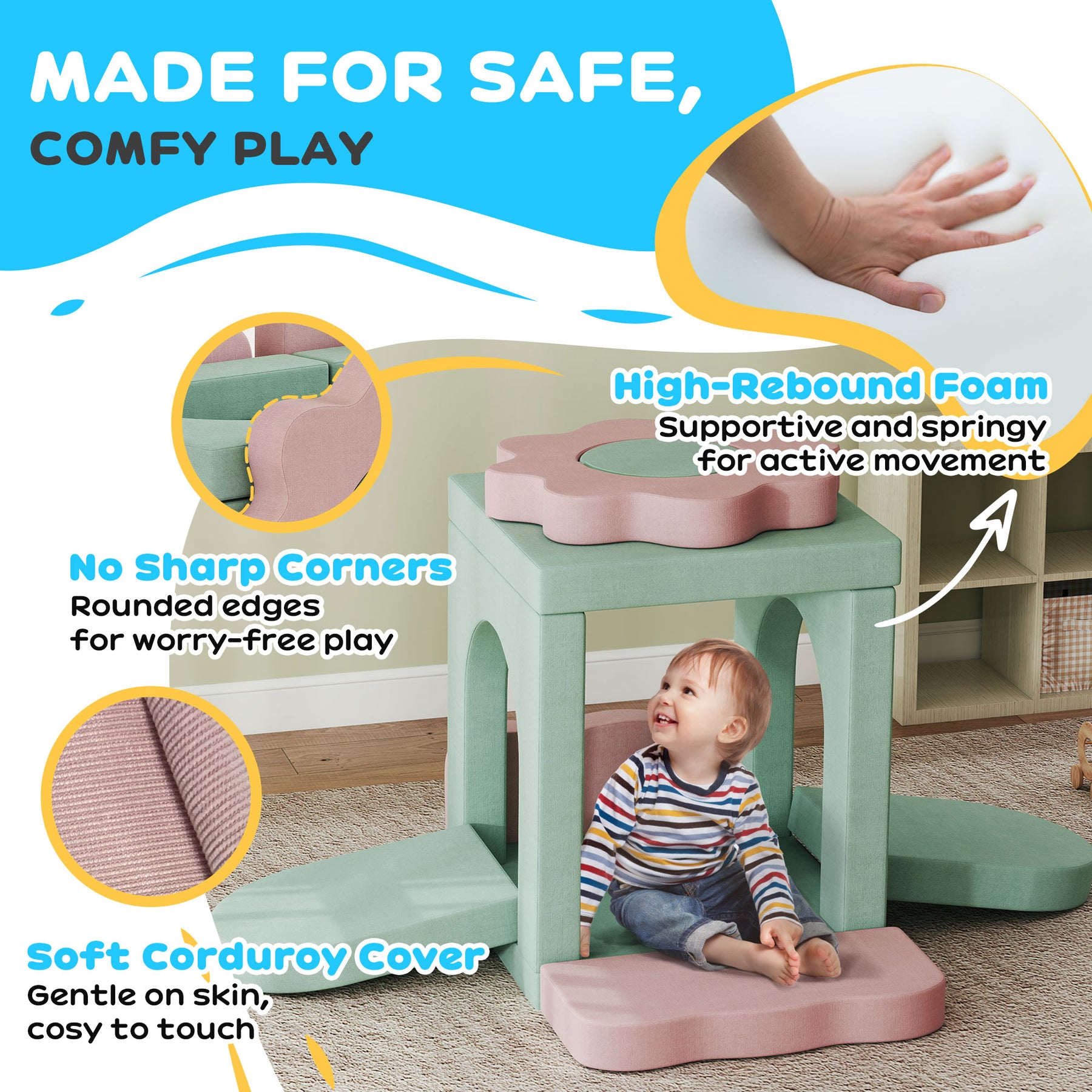 Turn your living space into a world of discovery with the Qaba baby climbing blocks. Designed for toddlers, its 12-piece foam climbing blocks feature flower and wave shapes that inspire creativity and exploration. Crafted from high-density polyurethane foam with a soft corduroy cover, it provides safe play while large arches and squares invite social fun. Suitable for climbing toys for toddlers, it transforms gatherings into joyful adventures.