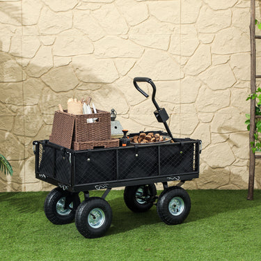 Discover the joys of outdoor utility with the Outsunny Garden Cart! Boasting a spacious 342L capacity, this camping cart simplifies hauling with its easy-to-move four-wheel design. Thanks to quick-release bolts and removable side meshes, transforming it into a flatbed trolley cart is a brebeach carteze. Great for gardeners and campers alike!