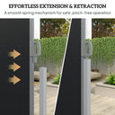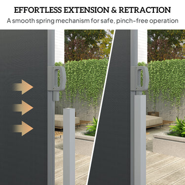 Transform your outdoor space with the Outsunny Retractable Side Awning! Crafted with 180g/m² high-density polyester and a PU coating, this retractable privacy screen shields against wind, rain, and UV rays (UV30+). Its tilt-adjustable poles enhance height and prevent sagging, making it the great outdoor privacy wall for your balcony or terrace. Simply extend or retract with a smooth, pinch-free operation.