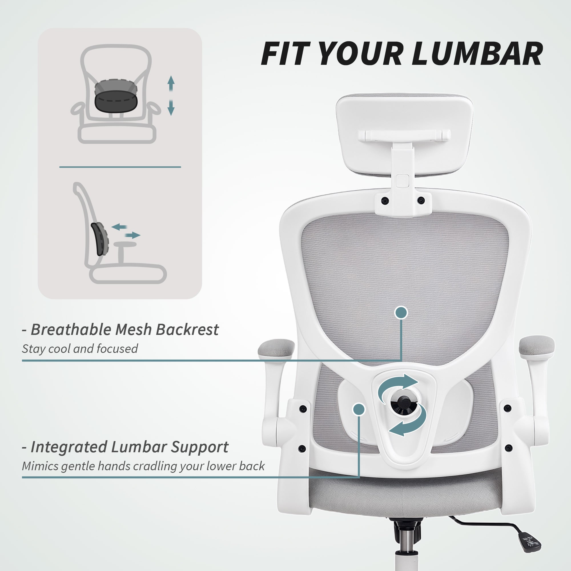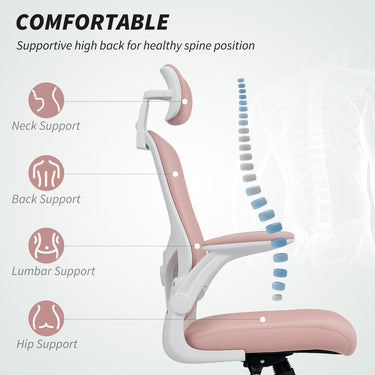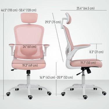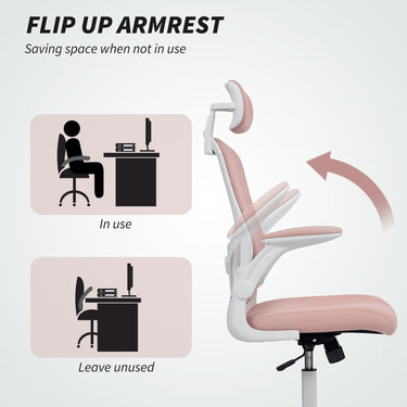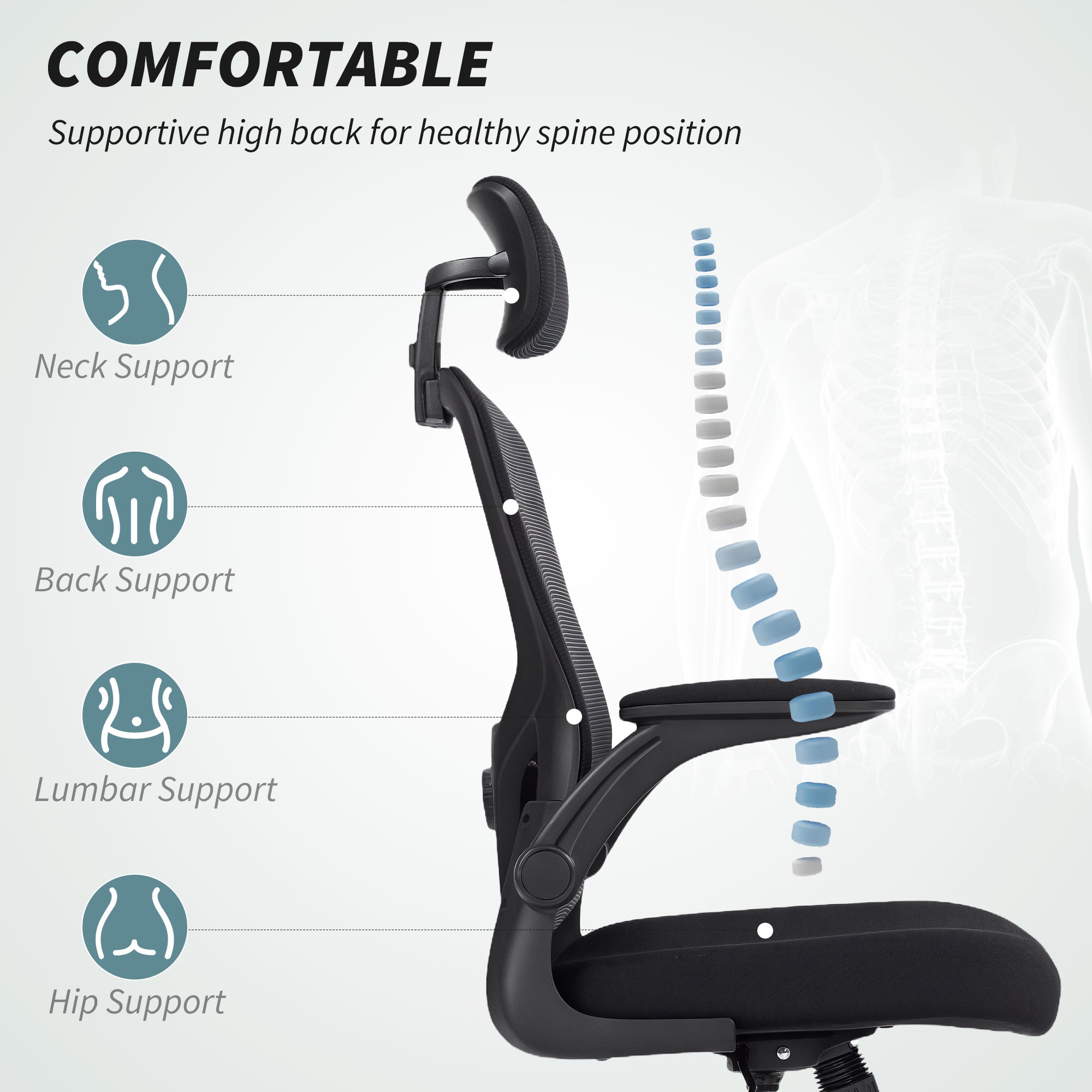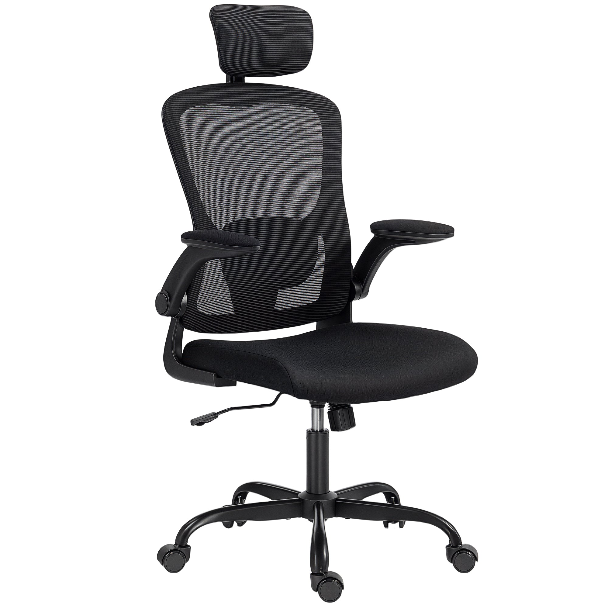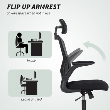 Experience unparalleled comfort with our HOMCOM ergonomic office chair, designed for those long work hours. Enjoy full-body support with a rotatable headrest and versatile 4D lumbar support. Stay cool with our breathable mesh fabric, ensuring airflow to keep you comfy and focused. Great for any office or dorm, its space-saving design with 90° flip-up armrests maximizes your room's potential.