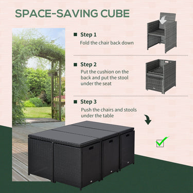 Outsunny 11 Pieces Wicker Patio Dining Set, Space-saving Outdoor Furniture Set with Removable Cushions, Glass Top Dining Table, 6 Armchairs, 4 Ottomans, PE Rattan Conversation Set