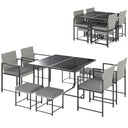 Transform your outdoor gatherings with the Outsunny 9-piece outdoor table and chairs. This patio conversation set includes a table, 4 chairs, and 4 stools that tuck neatly under the table for space-saving magic! Enjoy the comfort of thick, washable cushions and dine in style with a sleek tempered glass tabletop. This dining table set suits any patio conversation set or backyard furniture ensemble.