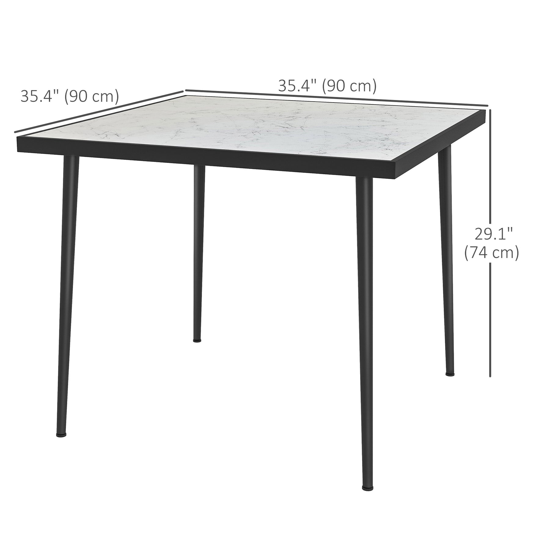 Bring your favourite people together outdoors, thanks to this Outsunny square dining table. A powder coated steel frame for a strong and supportive core, fitted with a glass tabletop. The glass is tempered for extra strength to ensure a safe dining surface-finished in a marble effect for beauty. Garden table is complete with adjustable feet for balance.