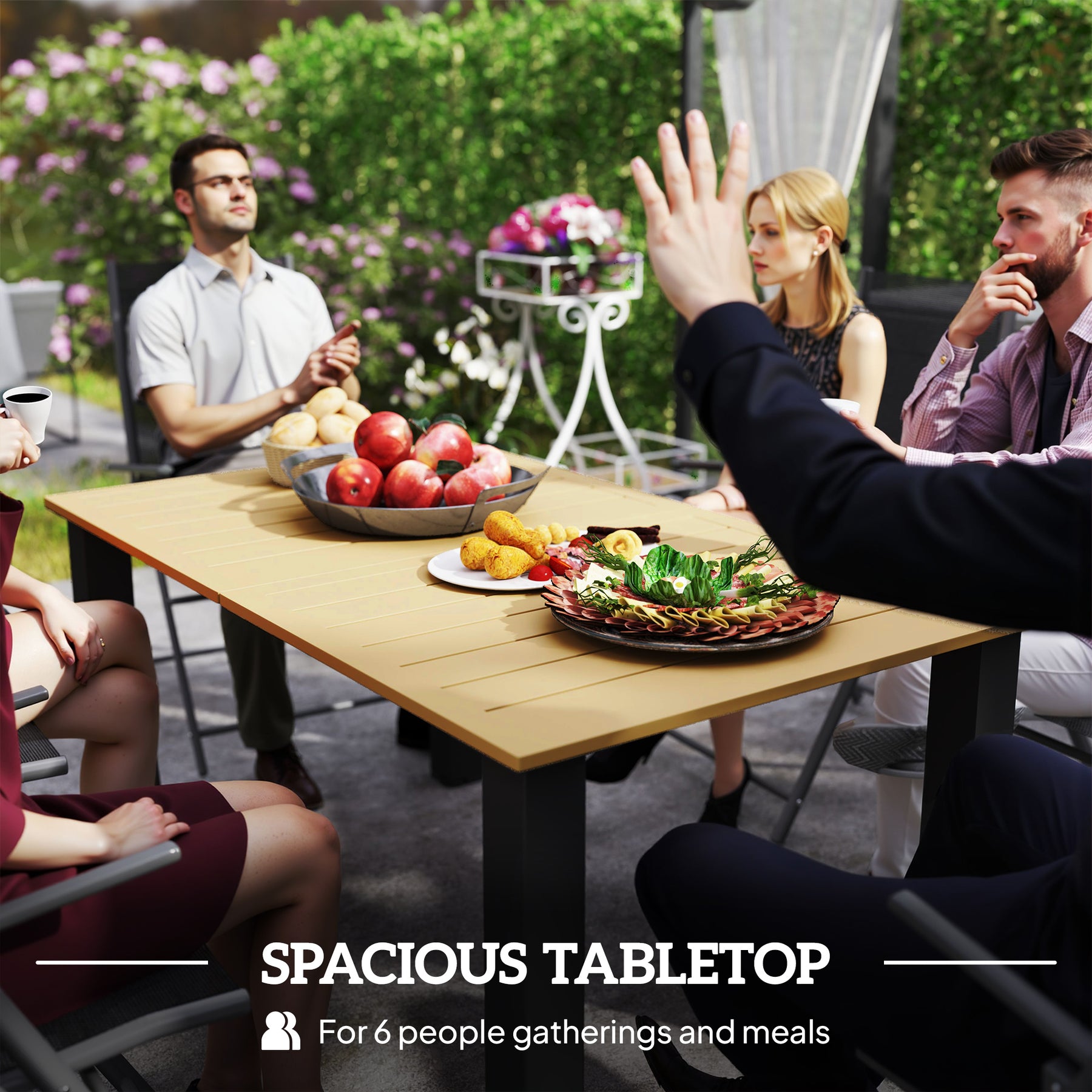 Discover the charm of the Outsunny Outdoor Small Table, your new centerpiece for every gathering. This spacious 59.1" x 35.4" (150 x 90 cm) table comfortably seats six and features a slatted design for airflow and visual appeal. It includes a practical umbrella hole for sunny days. Great for outdoor or indoor settings, from backyards to balconies, this table effortlessly blends functionality with style.