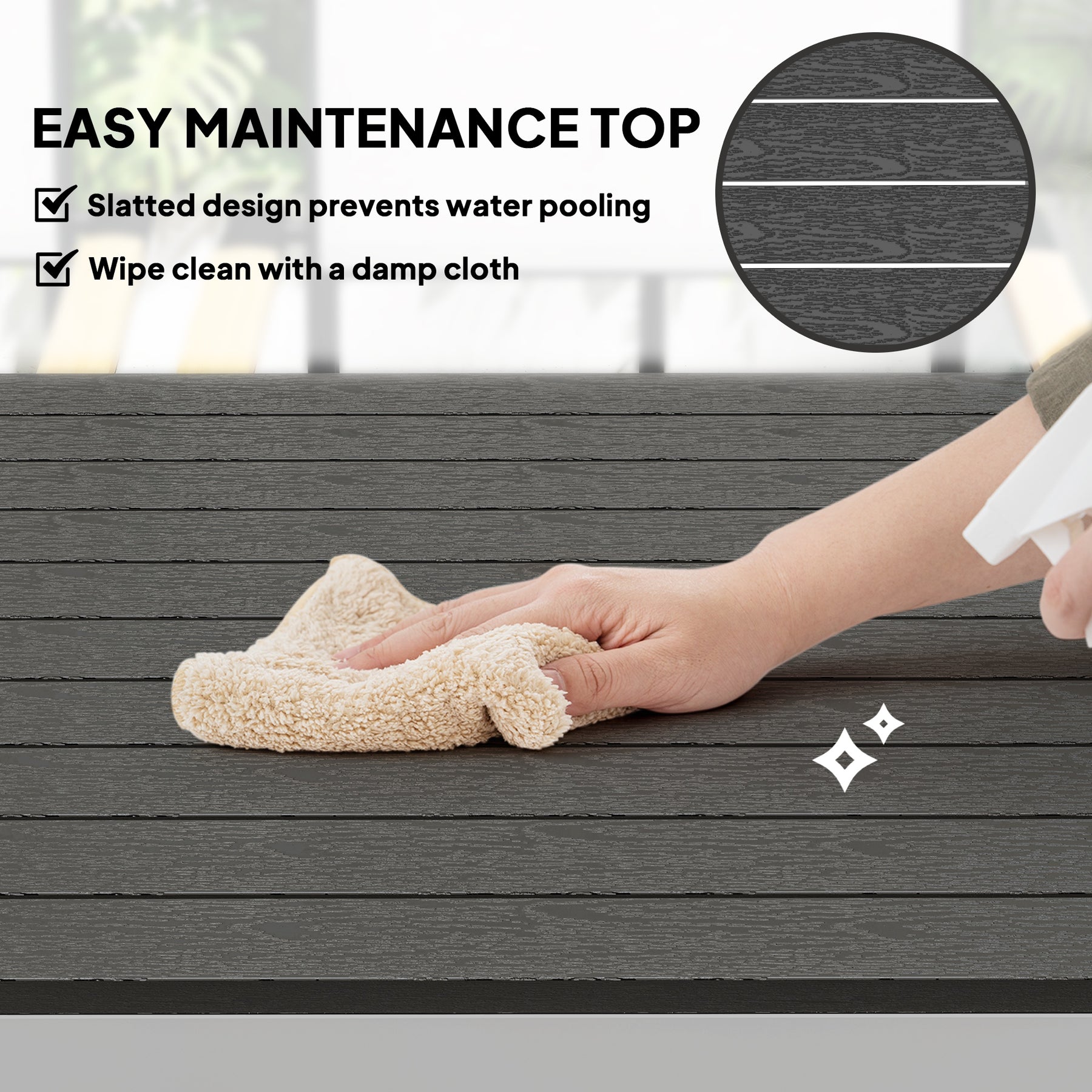 Transform your outdoor space with the Outsunny Garden Dining Table. Designed with a sleek, wood grain top in a modern minimalist style, this table complements any garden or patio. It seats 4-6 people comfortably and features a robust, easy-to-clean PS top and a water-resistant, rust-resistant frame, making it the great choice for any outdoor dining area.