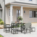 Transform your outdoor gatherings with the Outsunny 9-piece outdoor table and chairs. This patio conversation set includes a table, 4 chairs, and 4 stools that tuck neatly under the table for space-saving magic! Enjoy the comfort of thick, washable cushions and dine in style with a sleek tempered glass tabletop. This dining table set suits any patio conversation set or backyard furniture ensemble.