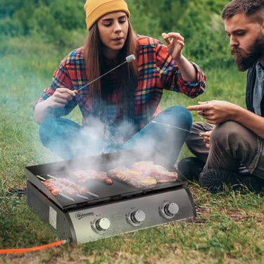 Upgrade your outdoor cooking with the Outsunny BBQ grill. Its triple burners provide separate cooking zones, each delivering 9000 BTU (2.5 kW) for efficient heat. The non-stick hotplate ensures easy cooking and cleaning, while the grease collection system keeps things tidy. With a regulator, hose, and 2 cm adjustable feet for stability, this portable grill is great for camping, festivals, and more.