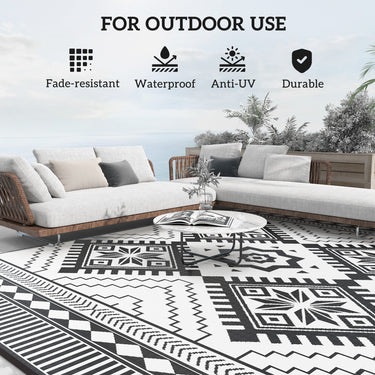 Camp on carpet with Outsunny. This porch rug is designed to handle dirt. Outdoor-ready, our rug really cleans up fast; sweep it, spray it, wipe it, or wave it; its powerful polypropylene fibers stay dry and don't saturate. Keep an outdoor rug in the camper, RV, or car; it's excellent for camping, beach trips, patio picnics, or anywhere outside. The colour is reversible, meaning you can flip our plastic rug over to have a fresh side or a fresh style. Upholster the outdoors with Outsunny.