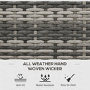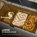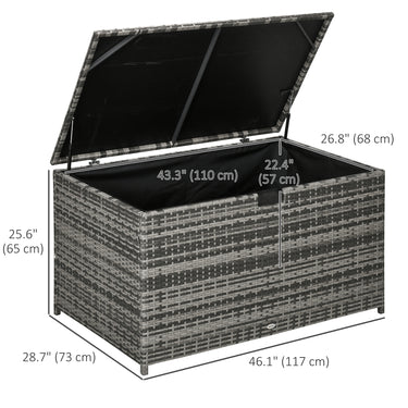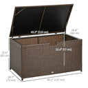 Deck storage box with waterproof liner from Outsunny is a solution for keeping your tools, supplies, or other accessories dry and clean. A safe and swift pneumatic bar lift mechanism, access your belongings has never been simpler. Handwoven PE rattan wrapped on the steel frame, adds a touch of classic aesthetics while offering enhanced water resistance. Whether you place it on your porch, patio, balcony, or poolside, the Outsunny rattan box is the great choice for outdoor storage.