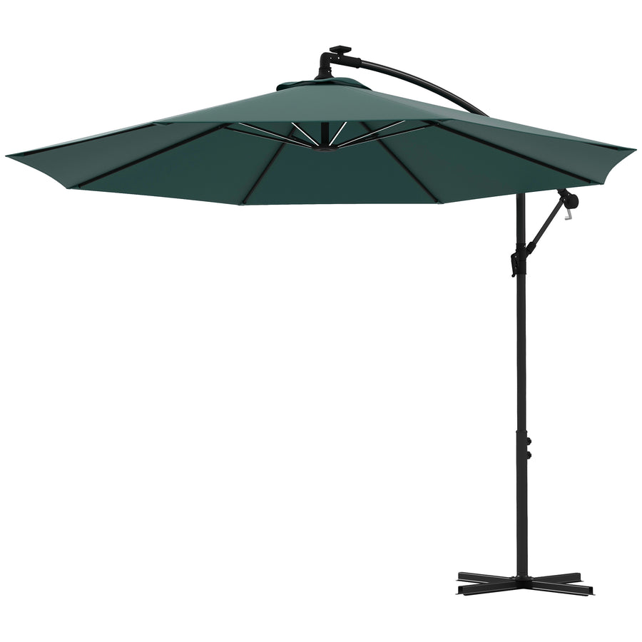 Extend your outdoor enjoyment into the evening with the Solar Powered LED Light Garden Umbrella form Outsunny. The cantilever design keeps the pole out of the way on this stationary patio umbrella. This led parasol is constructed with heavy duty polyester fabric and aluminum frame. Outdoor large garden umbrella can not only provide plenty of shade keeping you cool but also help create great atmosphere in the evening making a restful and unique vibrant style in your outdoor living areas.