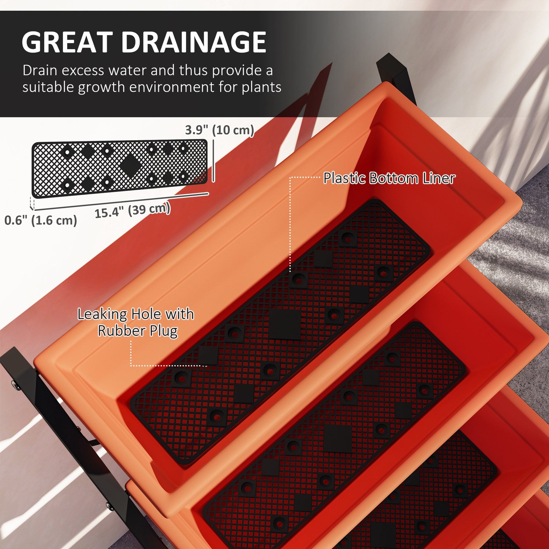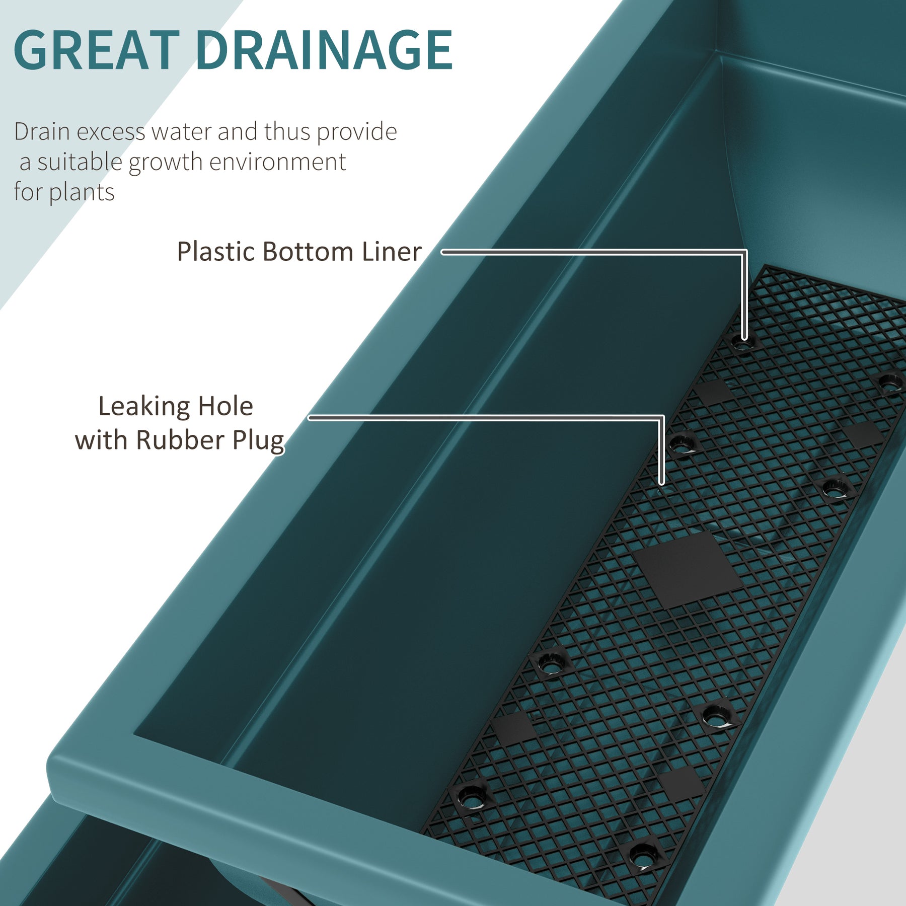 - • Leaking holes with rubber plugs on the bottom ensure quick drainage